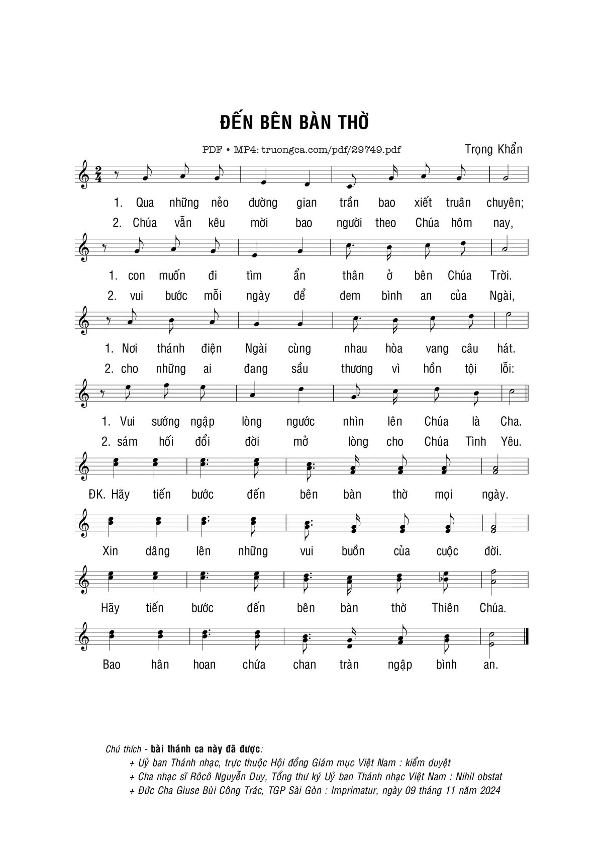 Sheet nhạc có nốt Đến bên bàn thờ của nhạc sĩ Trọng Khẩn và file PDF nốt nhạc đăng lên đây nhằm giúp các bạn xướng âm cho đúng nốt và hát thêm hay, chỉ mang tính chất tham khảo, không có mục đích thương mại. Bản quyền thuộc về tác giả và tổ chức nắm bản quyền, Truongca.com không giữ bất kỳ bản quyền của nội dung nào cả. Các bạn có thể tải về bản PDF chất lượng cao, gồm khuông nhạc có nốt với đường link file PDF bên trên.