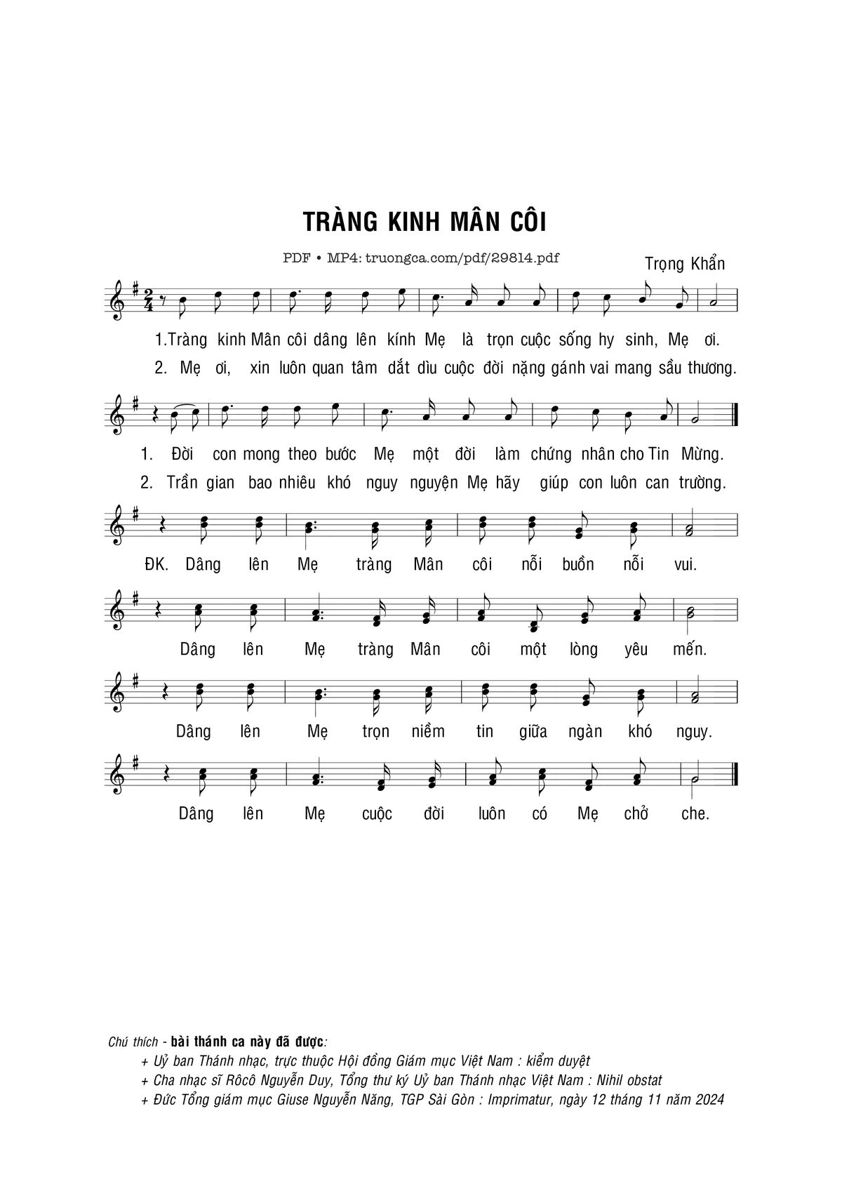 Sheet nhạc có nốt Tràng kinh Mân Côi của nhạc sĩ Trọng Khẩn và file PDF nốt nhạc đăng lên đây nhằm giúp các bạn xướng âm cho đúng nốt và hát thêm hay, chỉ mang tính chất tham khảo, không có mục đích thương mại. Bản quyền thuộc về tác giả và tổ chức nắm bản quyền, Truongca.com không giữ bất kỳ bản quyền của nội dung nào cả. Các bạn có thể tải về bản PDF chất lượng cao, gồm khuông nhạc có nốt với đường link file PDF bên trên.