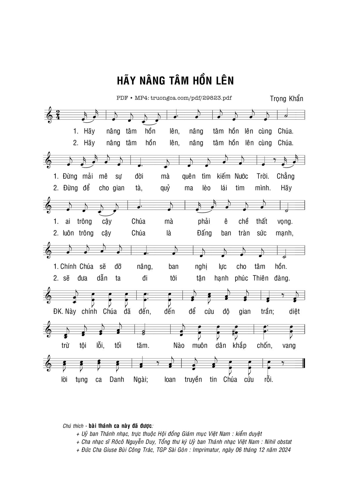 Sheet nhạc có nốt Hãy nâng tâm hồn lên của nhạc sĩ Trọng Khẩn và file PDF nốt nhạc đăng lên đây nhằm giúp các bạn xướng âm cho đúng nốt và hát thêm hay, chỉ mang tính chất tham khảo, không có mục đích thương mại. Bản quyền thuộc về tác giả và tổ chức nắm bản quyền, Truongca.com không giữ bất kỳ bản quyền của nội dung nào cả. Các bạn có thể tải về bản PDF chất lượng cao, gồm khuông nhạc có nốt với đường link file PDF bên trên.