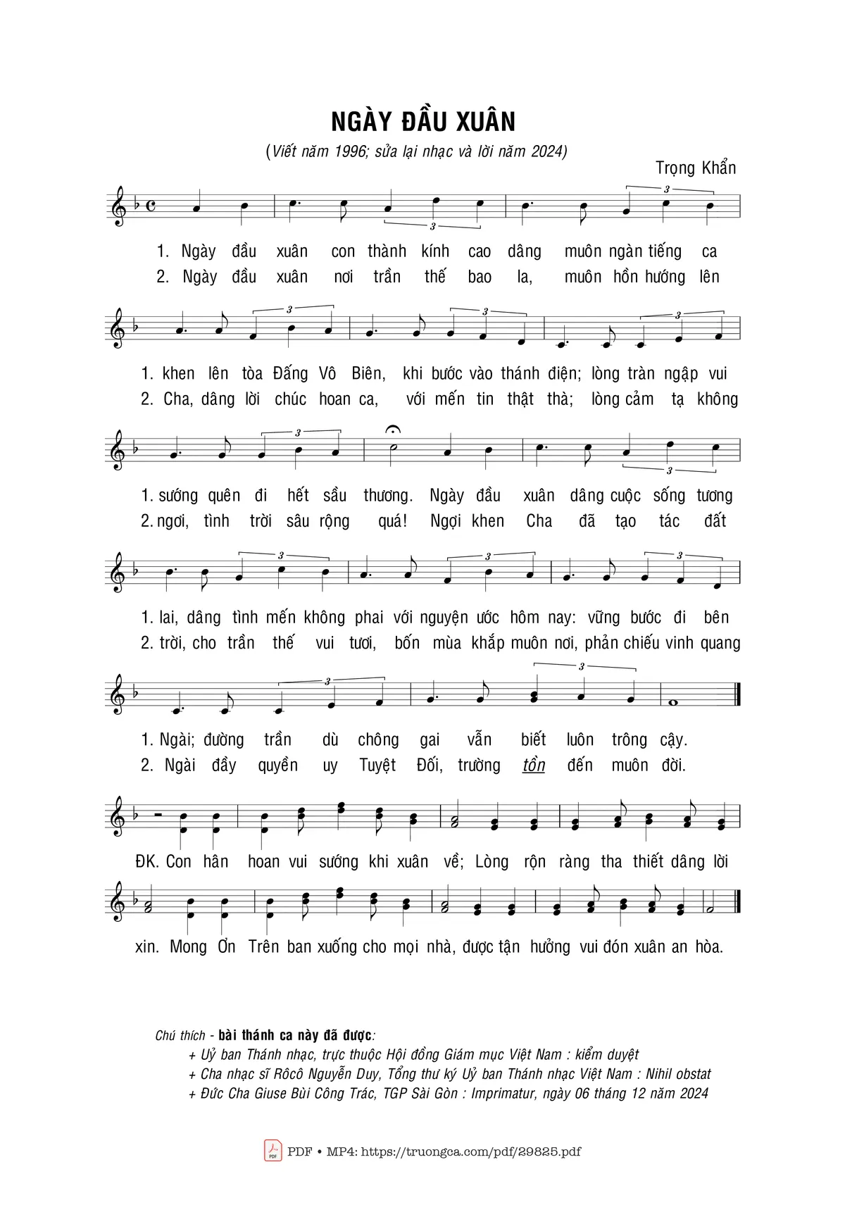 Sheet nhạc có nốt Ngày đầu xuân của nhạc sĩ Trọng Khẩn và file PDF nốt nhạc đăng lên đây nhằm giúp các bạn xướng âm cho đúng nốt và hát thêm hay, chỉ mang tính chất tham khảo, không có mục đích thương mại. Bản quyền thuộc về tác giả và tổ chức nắm bản quyền, Truongca.com không giữ bất kỳ bản quyền của nội dung nào cả. Các bạn có thể tải về bản PDF chất lượng cao, gồm khuông nhạc có nốt với đường link file PDF bên trên.