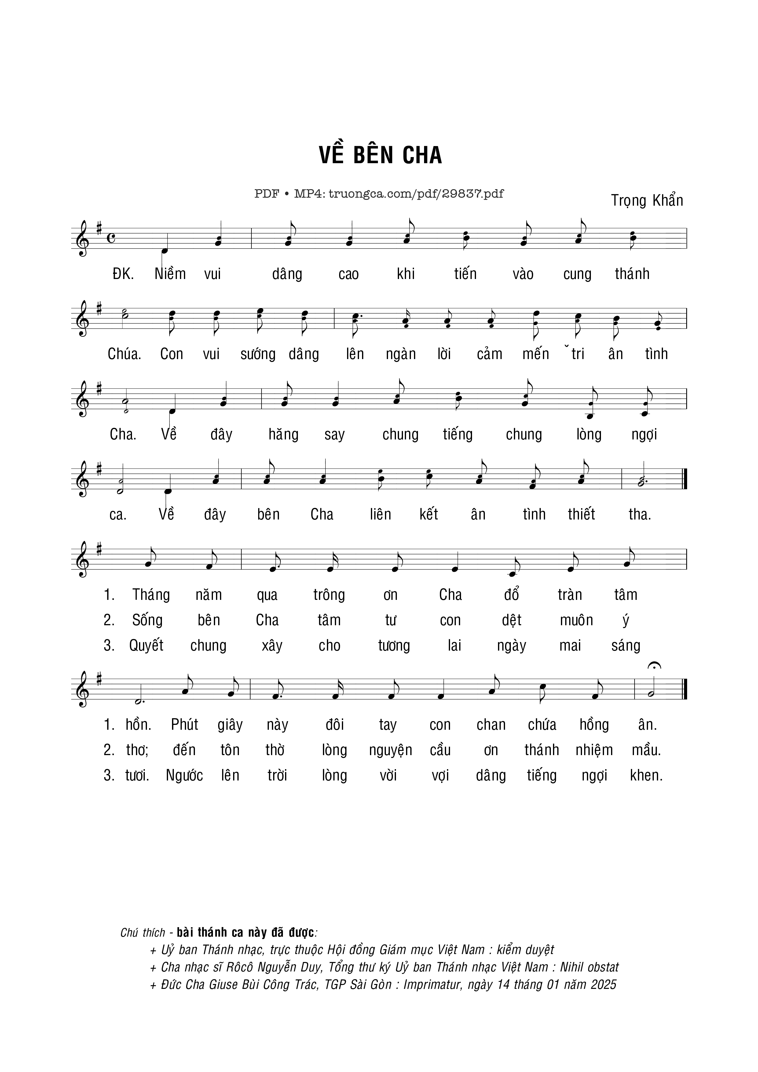Sheet nhạc có nốt Về bên Cha của nhạc sĩ Trọng Khẩn và file PDF nốt nhạc đăng lên đây nhằm giúp các bạn xướng âm cho đúng nốt và hát thêm hay, chỉ mang tính chất tham khảo, không có mục đích thương mại. Bản quyền thuộc về tác giả và tổ chức nắm bản quyền, Truongca.com không giữ bất kỳ bản quyền của nội dung nào cả. Các bạn có thể tải về bản PDF chất lượng cao, gồm khuông nhạc có nốt với đường link file PDF bên trên.