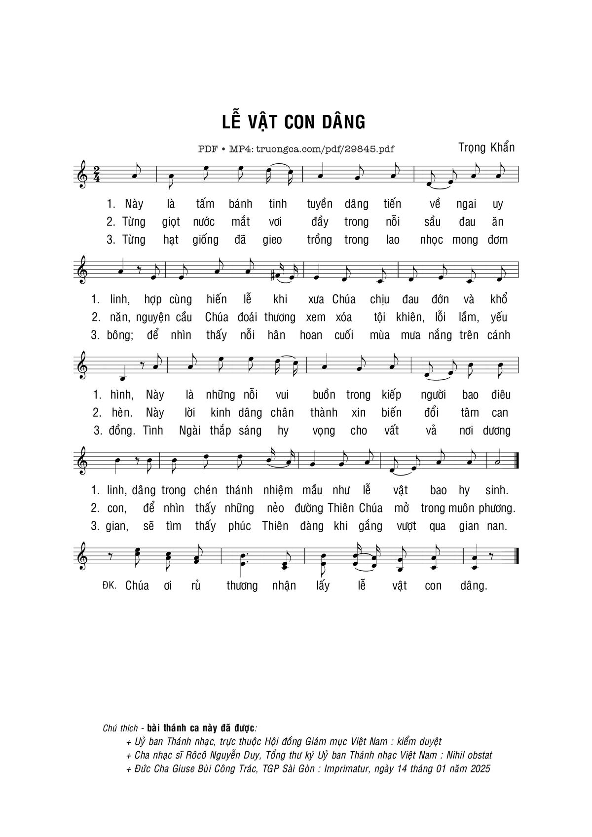 Sheet nhạc có nốt Lễ vật con dâng của nhạc sĩ Trọng Khẩn và file PDF nốt nhạc đăng lên đây nhằm giúp các bạn xướng âm cho đúng nốt và hát thêm hay, chỉ mang tính chất tham khảo, không có mục đích thương mại. Bản quyền thuộc về tác giả và tổ chức nắm bản quyền, Truongca.com không giữ bất kỳ bản quyền của nội dung nào cả. Các bạn có thể tải về bản PDF chất lượng cao, gồm khuông nhạc có nốt với đường link file PDF bên trên.