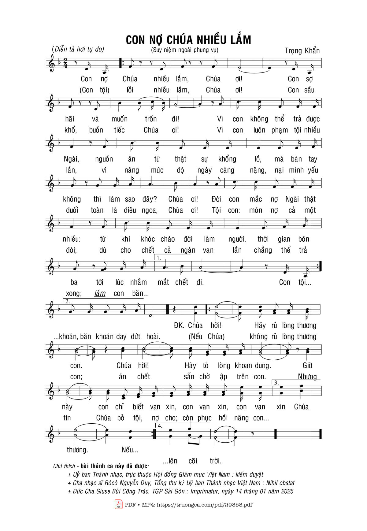 Sheet nhạc có nốt Con nợ Chúa nhiều lắm của nhạc sĩ Trọng Khẩn và file PDF nốt nhạc đăng lên đây nhằm giúp các bạn xướng âm cho đúng nốt và hát thêm hay, chỉ mang tính chất tham khảo, không có mục đích thương mại. Bản quyền thuộc về tác giả và tổ chức nắm bản quyền, Truongca.com không giữ bất kỳ bản quyền của nội dung nào cả. Các bạn có thể tải về bản PDF chất lượng cao, gồm khuông nhạc có nốt với đường link file PDF bên trên.