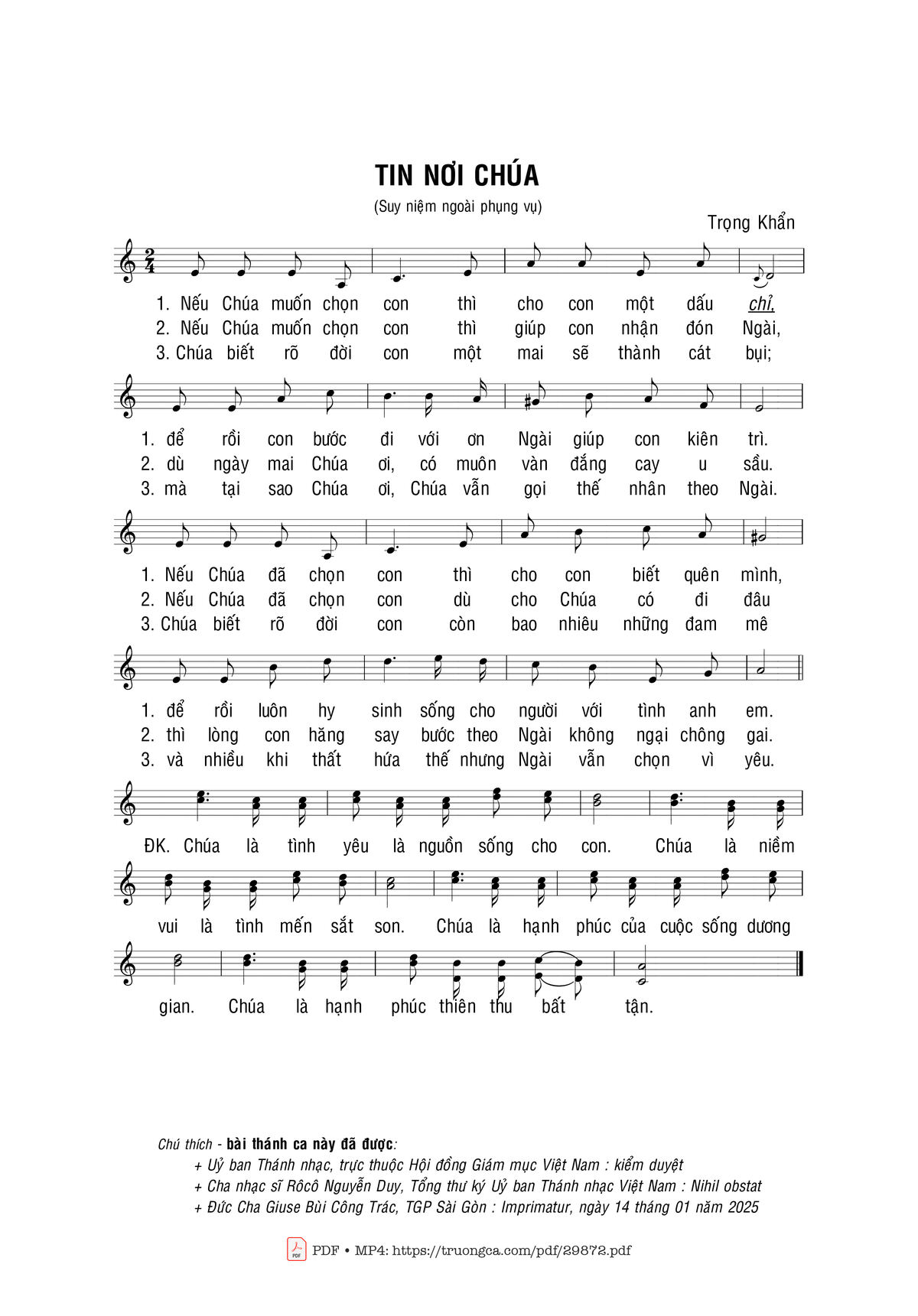 Sheet nhạc có nốt Tin nơi Chúa của nhạc sĩ Trọng Khẩn và file PDF nốt nhạc đăng lên đây nhằm giúp các bạn xướng âm cho đúng nốt và hát thêm hay, chỉ mang tính chất tham khảo, không có mục đích thương mại. Bản quyền thuộc về tác giả và tổ chức nắm bản quyền, Truongca.com không giữ bất kỳ bản quyền của nội dung nào cả. Các bạn có thể tải về bản PDF chất lượng cao, gồm khuông nhạc có nốt với đường link file PDF bên trên.