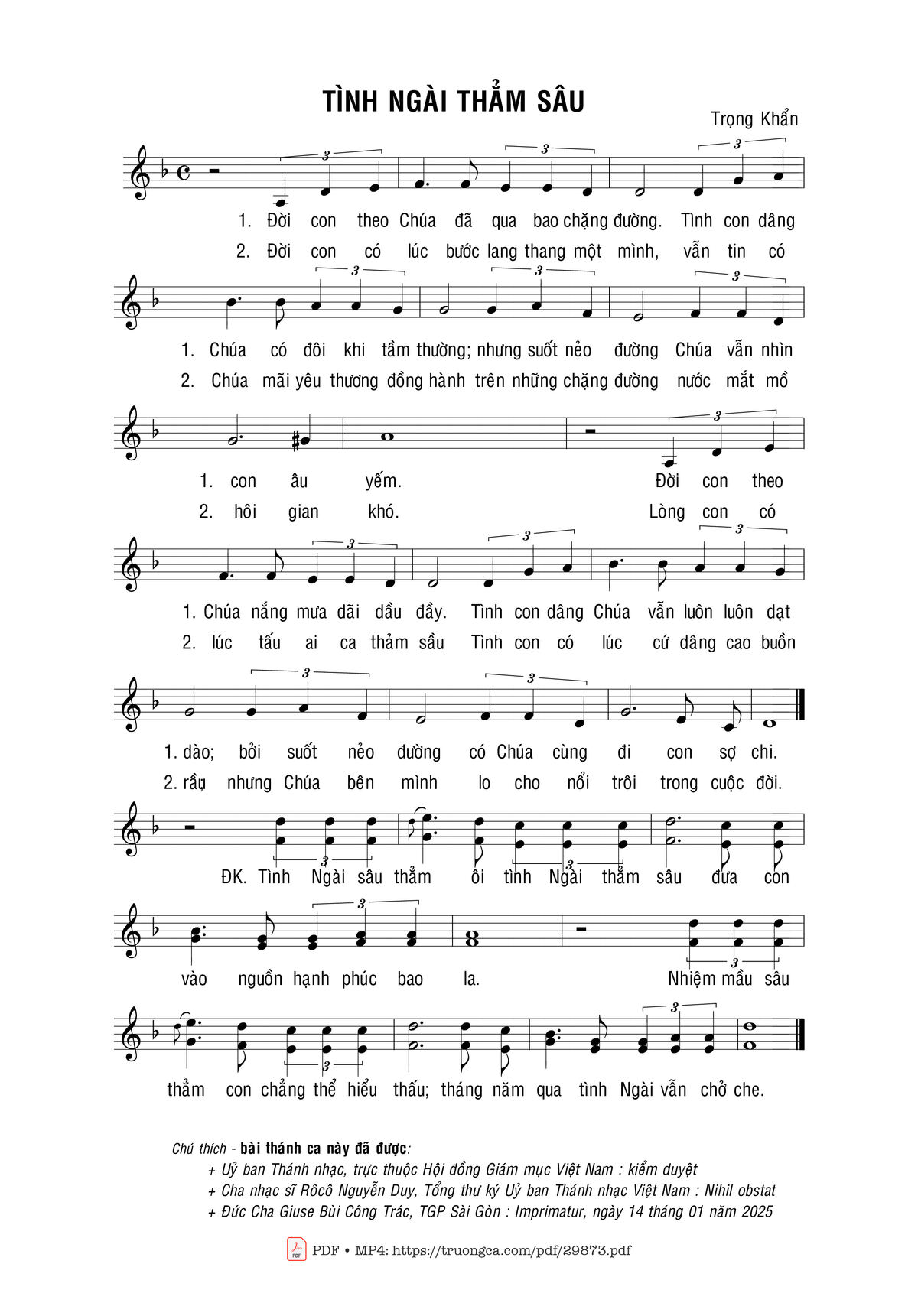 Sheet nhạc có nốt Tình Ngài thẳm sâu của nhạc sĩ Trọng Khẩn và file PDF nốt nhạc đăng lên đây nhằm giúp các bạn xướng âm cho đúng nốt và hát thêm hay, chỉ mang tính chất tham khảo, không có mục đích thương mại. Bản quyền thuộc về tác giả và tổ chức nắm bản quyền, Truongca.com không giữ bất kỳ bản quyền của nội dung nào cả. Các bạn có thể tải về bản PDF chất lượng cao, gồm khuông nhạc có nốt với đường link file PDF bên trên.