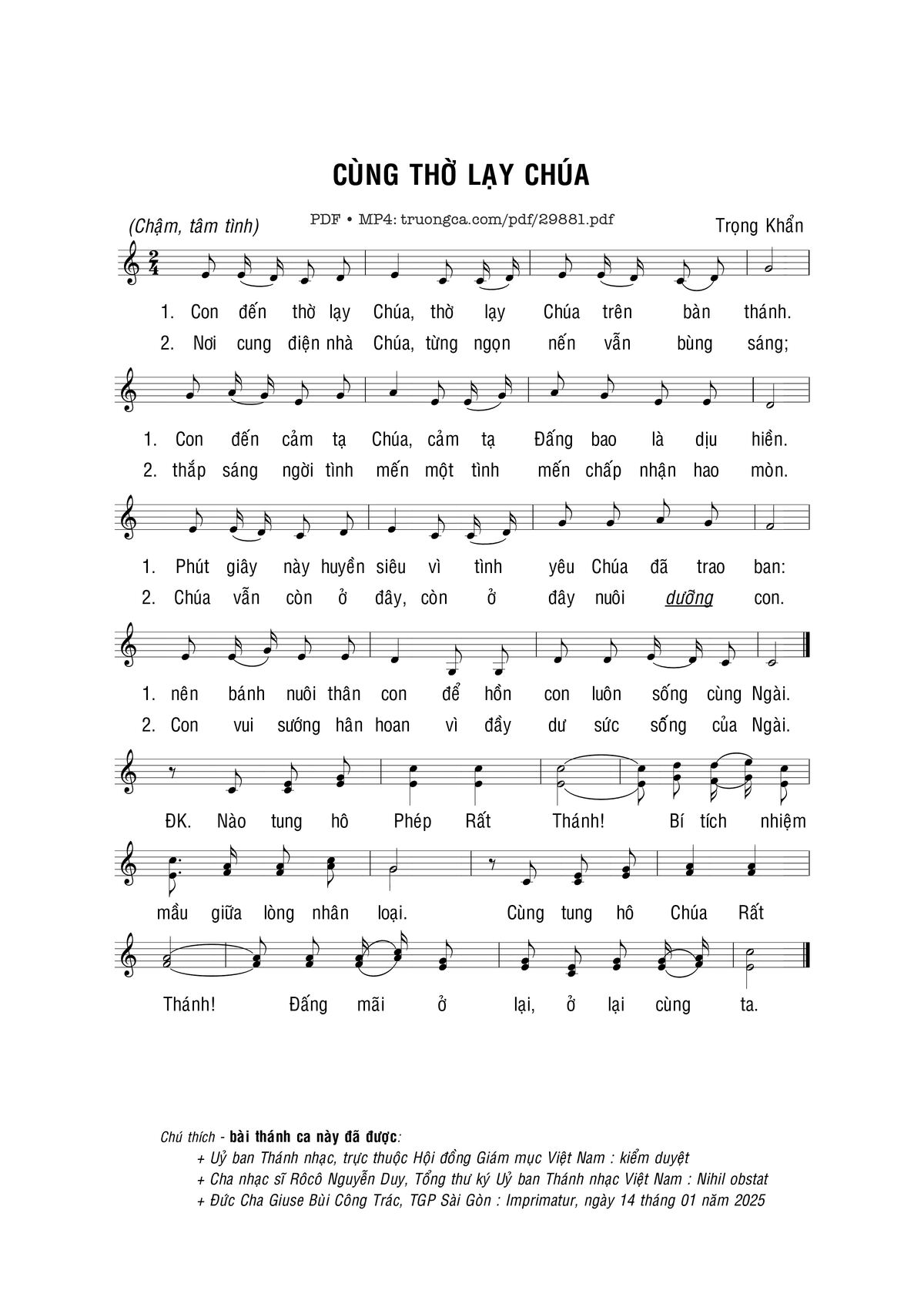 Sheet nhạc có nốt Cùng thờ lạy Chúa của nhạc sĩ Trọng Khẩn và file PDF nốt nhạc đăng lên đây nhằm giúp các bạn xướng âm cho đúng nốt và hát thêm hay, chỉ mang tính chất tham khảo, không có mục đích thương mại. Bản quyền thuộc về tác giả và tổ chức nắm bản quyền, Truongca.com không giữ bất kỳ bản quyền của nội dung nào cả. Các bạn có thể tải về bản PDF chất lượng cao, gồm khuông nhạc có nốt với đường link file PDF bên trên.