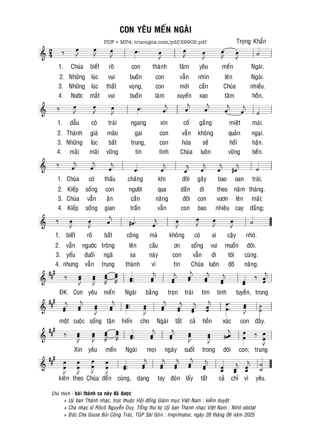 Sheet nhạc có nốt Con yêu mến Ngài của nhạc sĩ Trọng Khẩn và file PDF nốt nhạc đăng lên đây nhằm giúp các bạn xướng âm cho đúng nốt và hát thêm hay, chỉ mang tính chất tham khảo, không có mục đích thương mại. Bản quyền thuộc về tác giả và tổ chức nắm bản quyền, Truongca.com không giữ bất kỳ bản quyền của nội dung nào cả. Các bạn có thể tải về bản PDF chất lượng cao, gồm khuông nhạc có nốt với đường link file PDF bên trên.