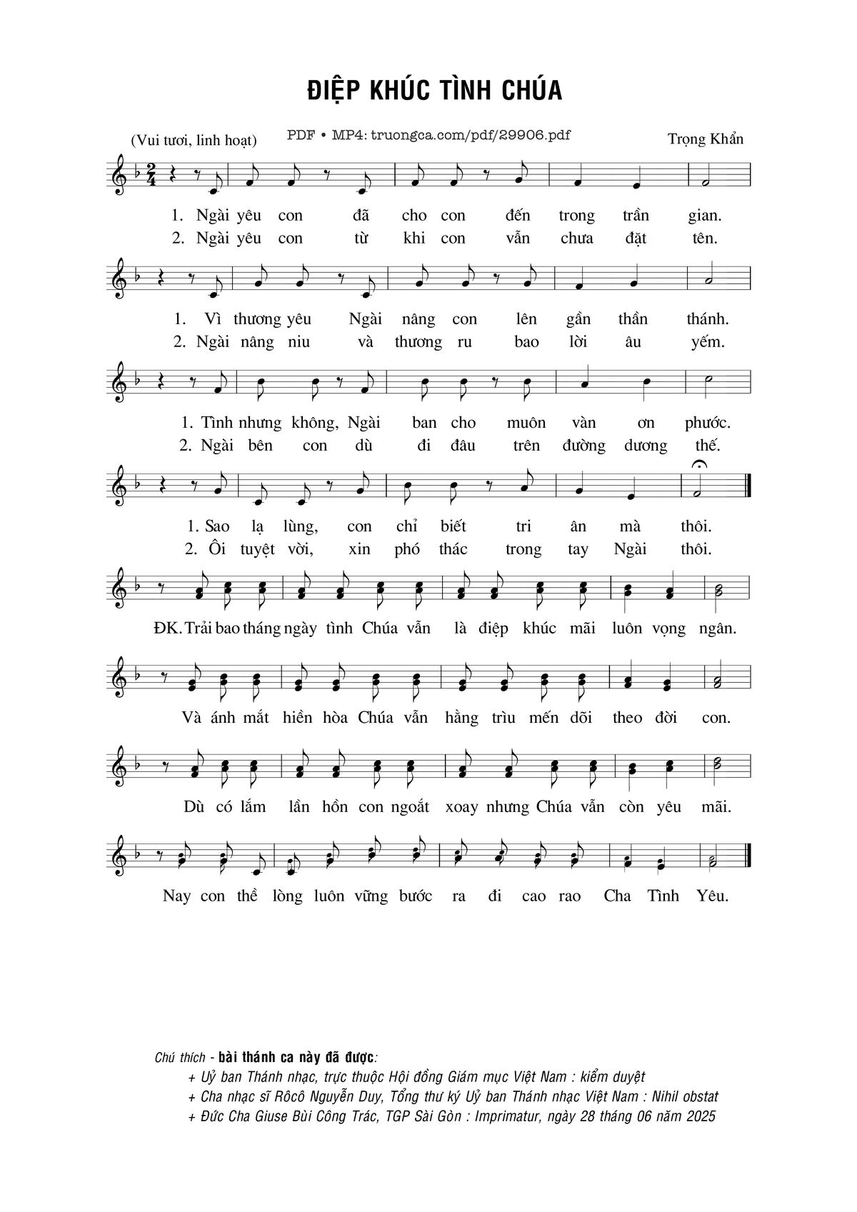 Sheet nhạc có nốt Điệp khúc tình Chúa của nhạc sĩ Trọng Khẩn và file PDF nốt nhạc đăng lên đây nhằm giúp các bạn xướng âm cho đúng nốt và hát thêm hay, chỉ mang tính chất tham khảo, không có mục đích thương mại. Bản quyền thuộc về tác giả và tổ chức nắm bản quyền, Truongca.com không giữ bất kỳ bản quyền của nội dung nào cả. Các bạn có thể tải về bản PDF chất lượng cao, gồm khuông nhạc có nốt với đường link file PDF bên trên.