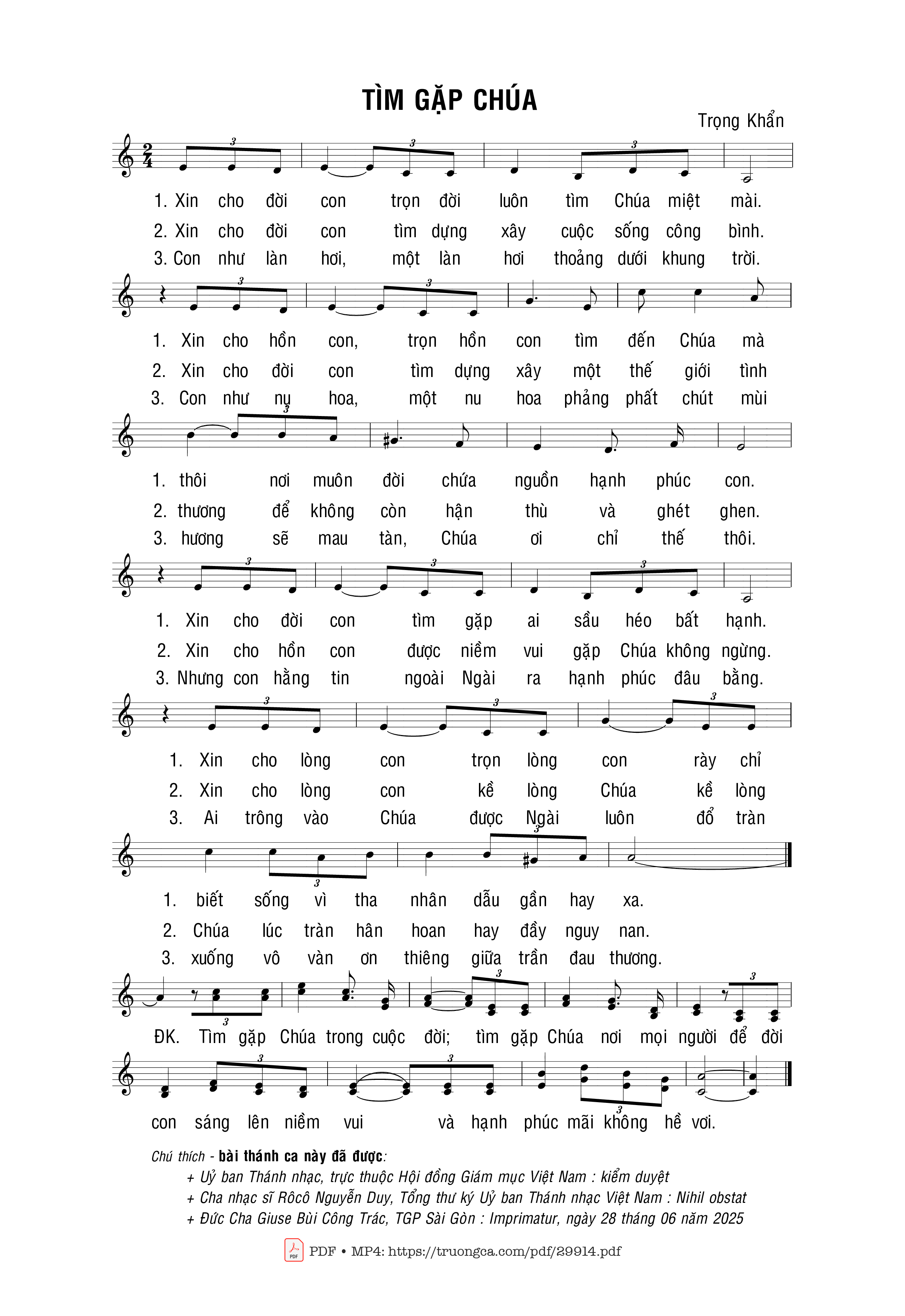 Sheet nhạc có nốt Tìm gặp Chúa của nhạc sĩ Trọng Khẩn và file PDF nốt nhạc đăng lên đây nhằm giúp các bạn xướng âm cho đúng nốt và hát thêm hay, chỉ mang tính chất tham khảo, không có mục đích thương mại. Bản quyền thuộc về tác giả và tổ chức nắm bản quyền, Truongca.com không giữ bất kỳ bản quyền của nội dung nào cả. Các bạn có thể tải về bản PDF chất lượng cao, gồm khuông nhạc có nốt với đường link file PDF bên trên.