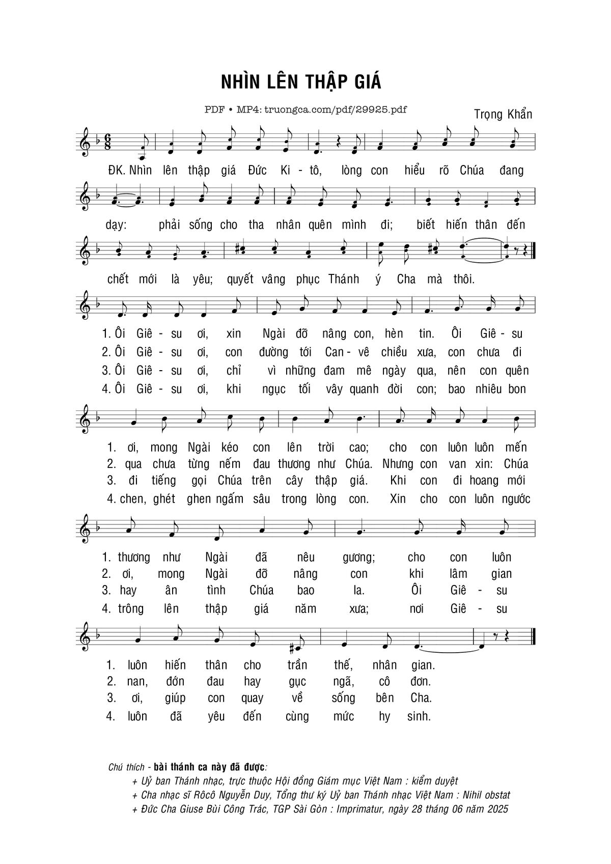 Sheet nhạc có nốt Nhìn lên thập giá của nhạc sĩ Trọng Khẩn và file PDF nốt nhạc đăng lên đây nhằm giúp các bạn xướng âm cho đúng nốt và hát thêm hay, chỉ mang tính chất tham khảo, không có mục đích thương mại. Bản quyền thuộc về tác giả và tổ chức nắm bản quyền, Truongca.com không giữ bất kỳ bản quyền của nội dung nào cả. Các bạn có thể tải về bản PDF chất lượng cao, gồm khuông nhạc có nốt với đường link file PDF bên trên.