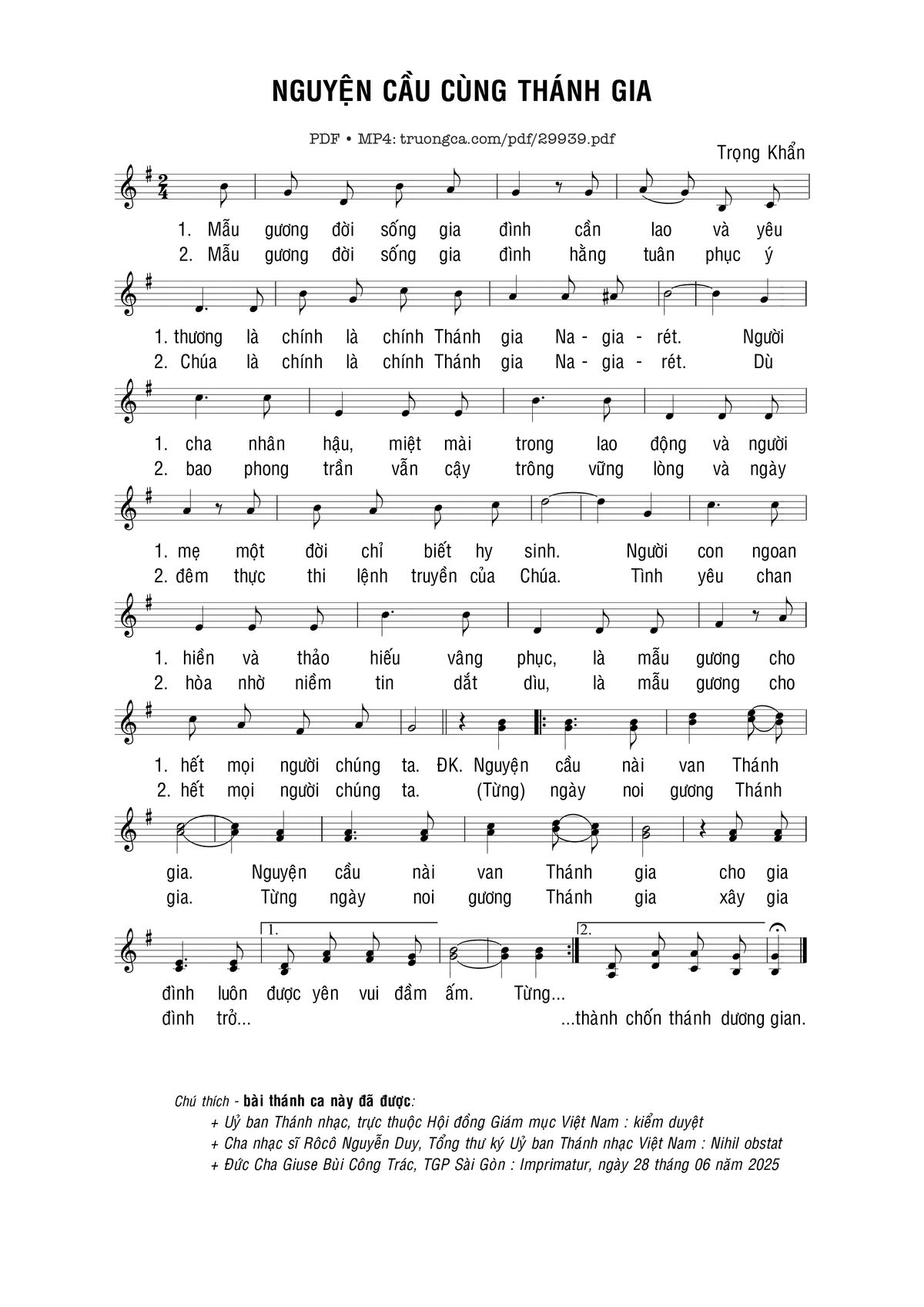 Sheet nhạc có nốt Nguyện cầu cùng Thánh gia của nhạc sĩ Trọng Khẩn và file PDF nốt nhạc đăng lên đây nhằm giúp các bạn xướng âm cho đúng nốt và hát thêm hay, chỉ mang tính chất tham khảo, không có mục đích thương mại. Bản quyền thuộc về tác giả và tổ chức nắm bản quyền, Truongca.com không giữ bất kỳ bản quyền của nội dung nào cả. Các bạn có thể tải về bản PDF chất lượng cao, gồm khuông nhạc có nốt với đường link file PDF bên trên.
