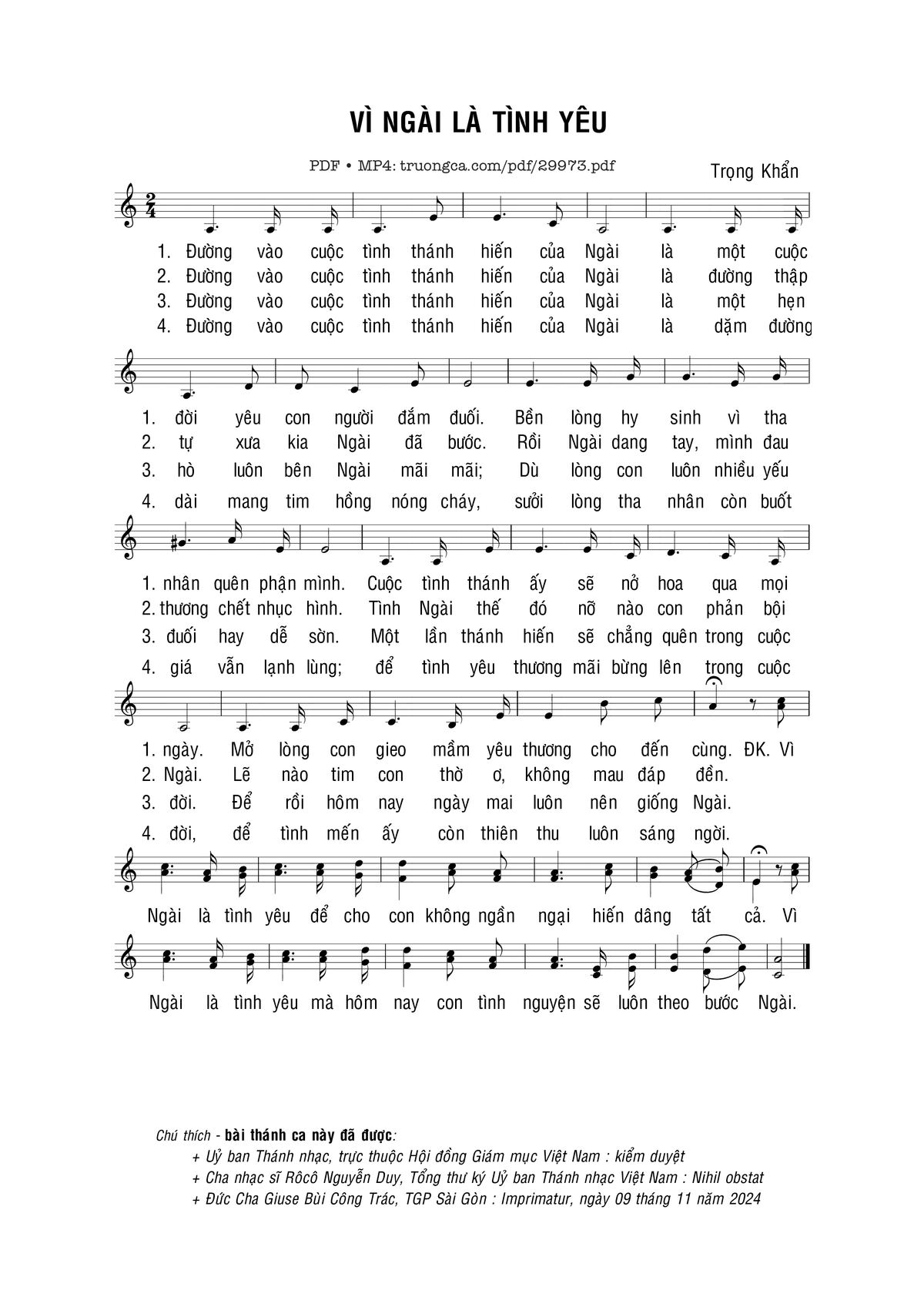 Sheet nhạc có nốt Vì Ngài là Tình Yêu của nhạc sĩ Trọng Khẩn và file PDF nốt nhạc đăng lên đây nhằm giúp các bạn xướng âm cho đúng nốt và hát thêm hay, chỉ mang tính chất tham khảo, không có mục đích thương mại. Bản quyền thuộc về tác giả và tổ chức nắm bản quyền, Truongca.com không giữ bất kỳ bản quyền của nội dung nào cả. Các bạn có thể tải về bản PDF chất lượng cao, gồm khuông nhạc có nốt với đường link file PDF bên trên.
