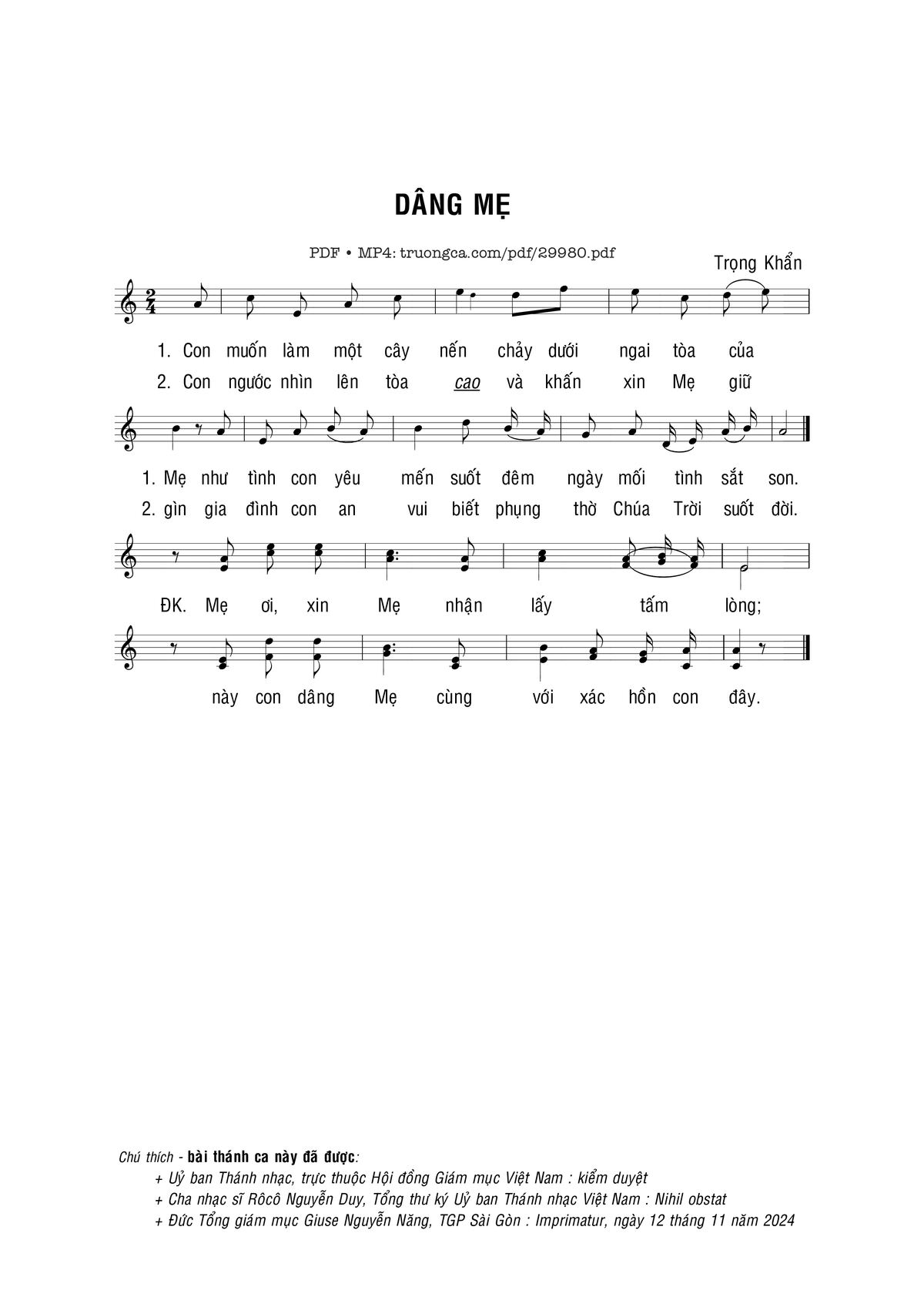 Sheet nhạc có nốt Dâng Mẹ của nhạc sĩ Trọng Khẩn và file PDF nốt nhạc đăng lên đây nhằm giúp các bạn xướng âm cho đúng nốt và hát thêm hay, chỉ mang tính chất tham khảo, không có mục đích thương mại. Bản quyền thuộc về tác giả và tổ chức nắm bản quyền, Truongca.com không giữ bất kỳ bản quyền của nội dung nào cả. Các bạn có thể tải về bản PDF chất lượng cao, gồm khuông nhạc có nốt với đường link file PDF bên trên.