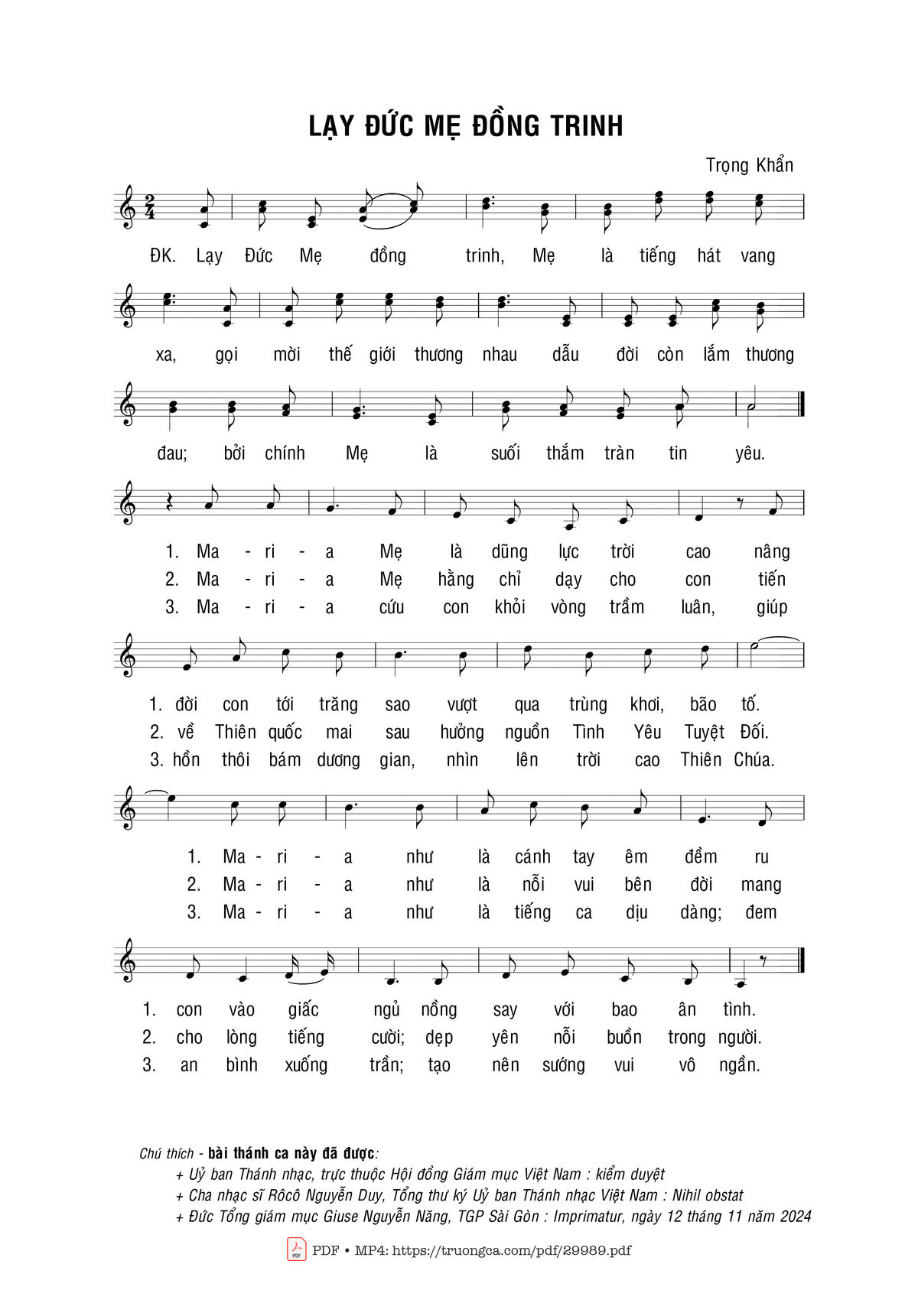 Sheet nhạc có nốt Lạy Đức Mẹ đồng trinh của nhạc sĩ Trọng Khẩn và file PDF nốt nhạc đăng lên đây nhằm giúp các bạn xướng âm cho đúng nốt và hát thêm hay, chỉ mang tính chất tham khảo, không có mục đích thương mại. Bản quyền thuộc về tác giả và tổ chức nắm bản quyền, Truongca.com không giữ bất kỳ bản quyền của nội dung nào cả. Các bạn có thể tải về bản PDF chất lượng cao, gồm khuông nhạc có nốt với đường link file PDF bên trên.