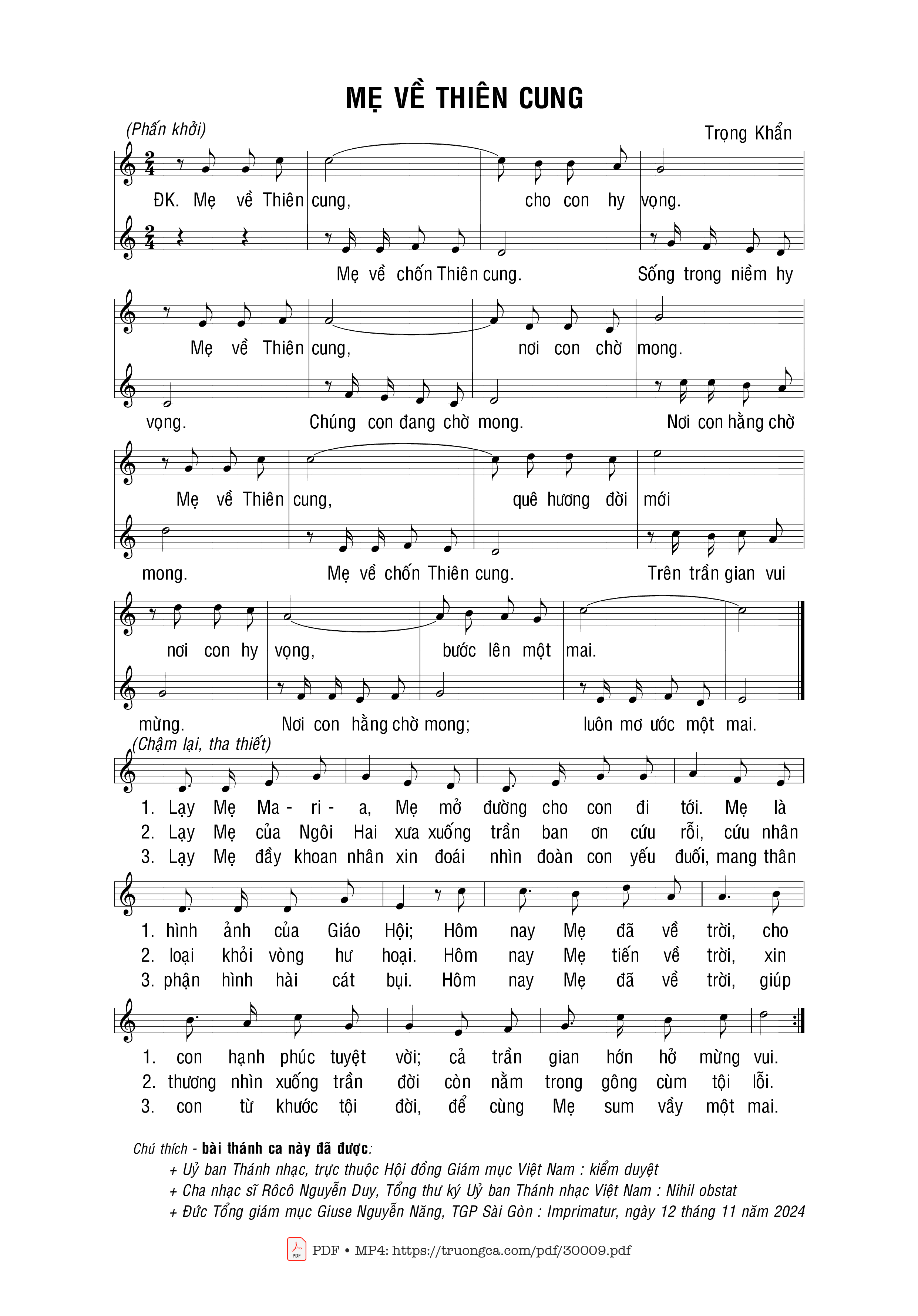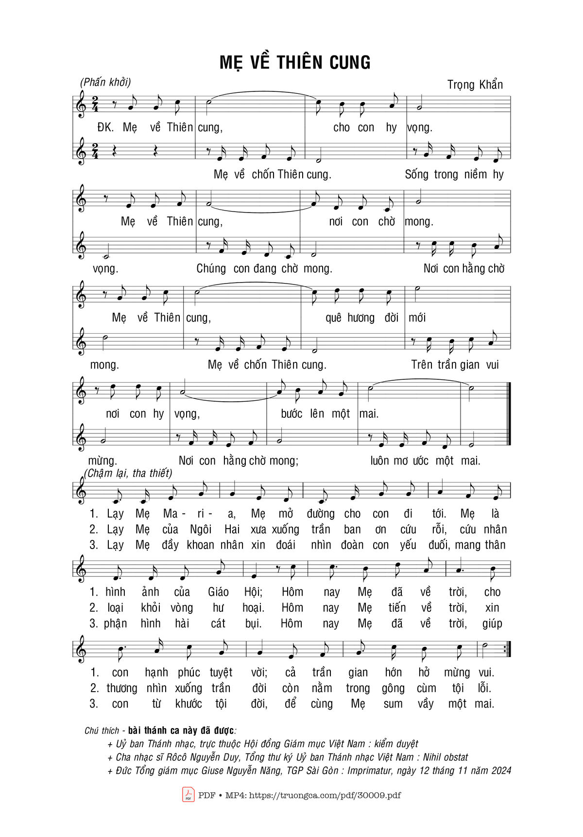Sheet nhạc có nốt Mẹ về Thiên Cung của nhạc sĩ Trọng Khẩn và file PDF nốt nhạc đăng lên đây nhằm giúp các bạn xướng âm cho đúng nốt và hát thêm hay, chỉ mang tính chất tham khảo, không có mục đích thương mại. Bản quyền thuộc về tác giả và tổ chức nắm bản quyền, Truongca.com không giữ bất kỳ bản quyền của nội dung nào cả. Các bạn có thể tải về bản PDF chất lượng cao, gồm khuông nhạc có nốt với đường link file PDF bên trên.