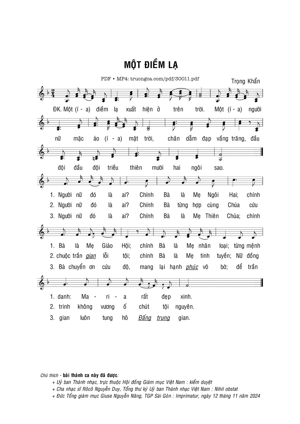 Sheet nhạc có nốt Một điềm lạ của nhạc sĩ Trọng Khẩn và file PDF nốt nhạc đăng lên đây nhằm giúp các bạn xướng âm cho đúng nốt và hát thêm hay, chỉ mang tính chất tham khảo, không có mục đích thương mại. Bản quyền thuộc về tác giả và tổ chức nắm bản quyền, Truongca.com không giữ bất kỳ bản quyền của nội dung nào cả. Các bạn có thể tải về bản PDF chất lượng cao, gồm khuông nhạc có nốt với đường link file PDF bên trên.