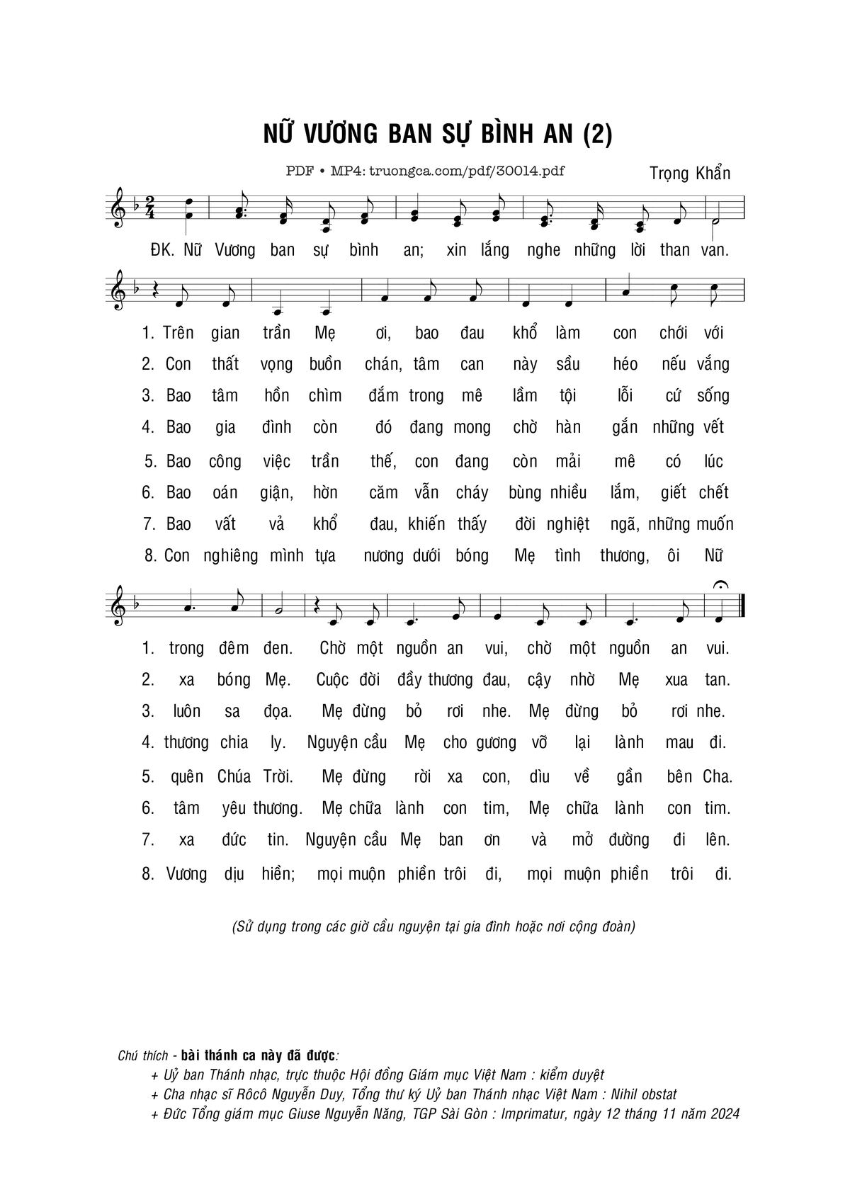Sheet nhạc có nốt Nữ Vương ban sự bình an II của nhạc sĩ Trọng Khẩn và file PDF nốt nhạc đăng lên đây nhằm giúp các bạn xướng âm cho đúng nốt và hát thêm hay, chỉ mang tính chất tham khảo, không có mục đích thương mại. Bản quyền thuộc về tác giả và tổ chức nắm bản quyền, Truongca.com không giữ bất kỳ bản quyền của nội dung nào cả. Các bạn có thể tải về bản PDF chất lượng cao, gồm khuông nhạc có nốt với đường link file PDF bên trên.