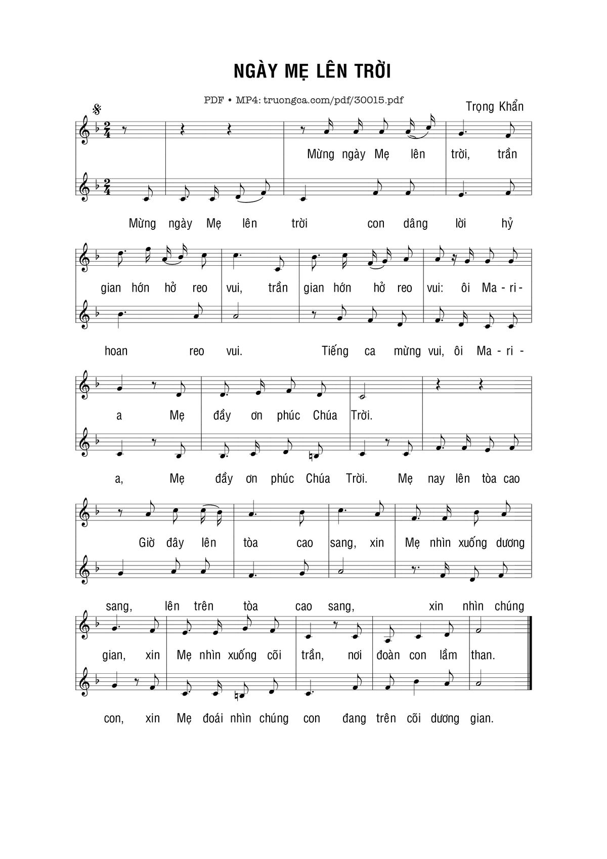 Sheet nhạc có nốt Ngày Mẹ lên trời của nhạc sĩ Trọng Khẩn và file PDF nốt nhạc đăng lên đây nhằm giúp các bạn xướng âm cho đúng nốt và hát thêm hay, chỉ mang tính chất tham khảo, không có mục đích thương mại. Bản quyền thuộc về tác giả và tổ chức nắm bản quyền, Truongca.com không giữ bất kỳ bản quyền của nội dung nào cả. Các bạn có thể tải về bản PDF chất lượng cao, gồm khuông nhạc có nốt với đường link file PDF bên trên.
