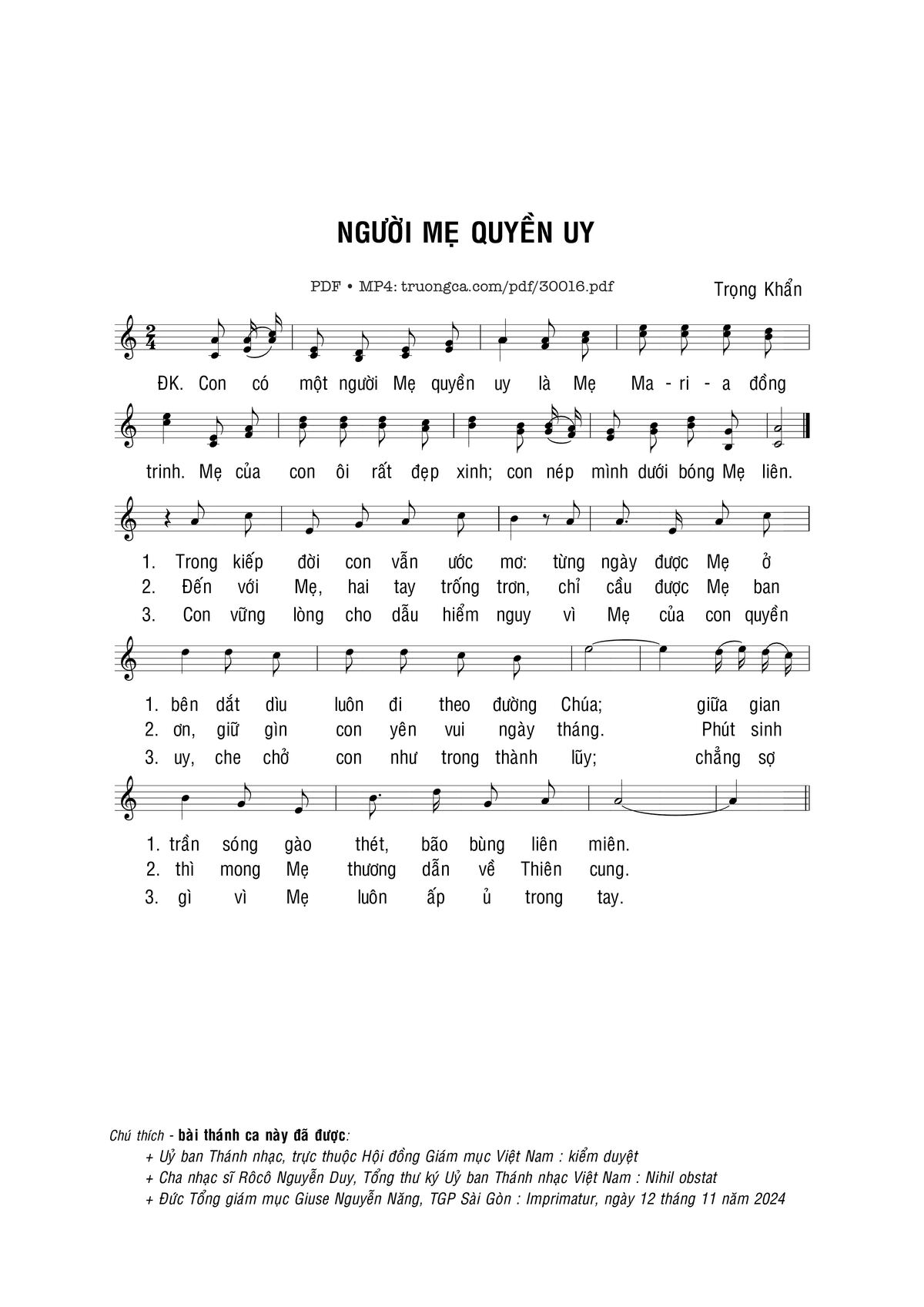 Sheet nhạc có nốt Người Mẹ quyền uy của nhạc sĩ Trọng Khẩn và file PDF nốt nhạc đăng lên đây nhằm giúp các bạn xướng âm cho đúng nốt và hát thêm hay, chỉ mang tính chất tham khảo, không có mục đích thương mại. Bản quyền thuộc về tác giả và tổ chức nắm bản quyền, Truongca.com không giữ bất kỳ bản quyền của nội dung nào cả. Các bạn có thể tải về bản PDF chất lượng cao, gồm khuông nhạc có nốt với đường link file PDF bên trên.