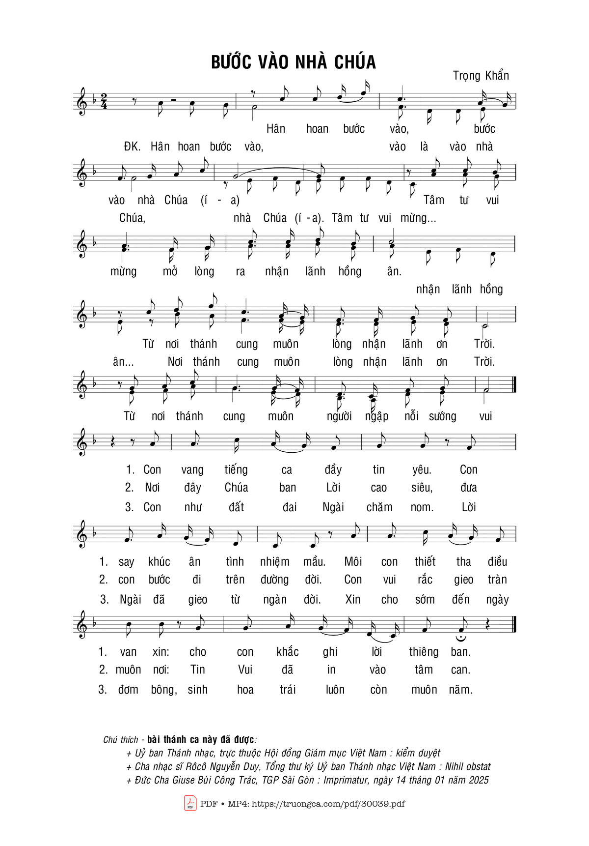 Sheet nhạc có nốt Bước vào nhà Chúa của nhạc sĩ Trọng Khẩn và file PDF nốt nhạc đăng lên đây nhằm giúp các bạn xướng âm cho đúng nốt và hát thêm hay, chỉ mang tính chất tham khảo, không có mục đích thương mại. Bản quyền thuộc về tác giả và tổ chức nắm bản quyền, Truongca.com không giữ bất kỳ bản quyền của nội dung nào cả. Các bạn có thể tải về bản PDF chất lượng cao, gồm khuông nhạc có nốt với đường link file PDF bên trên.