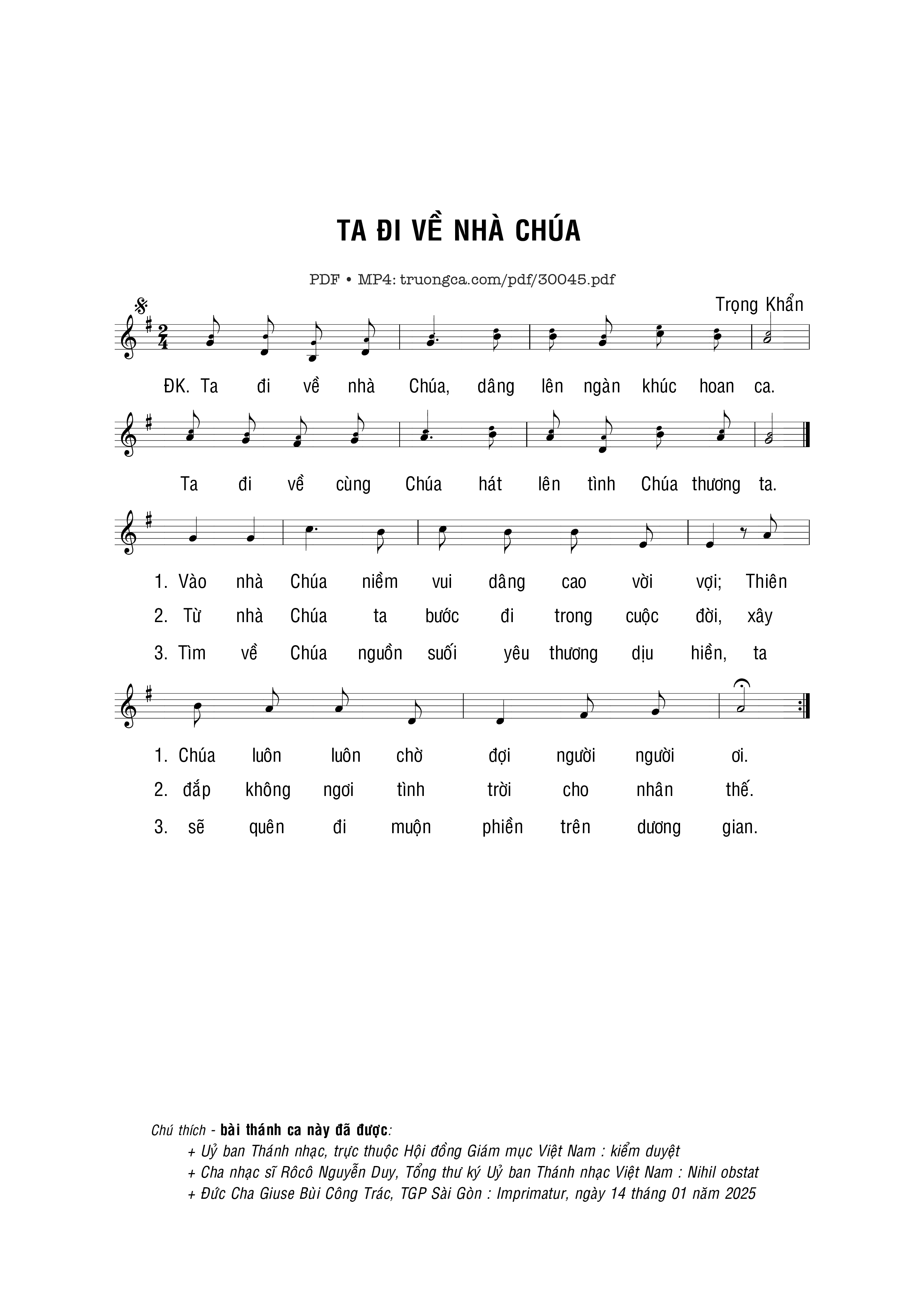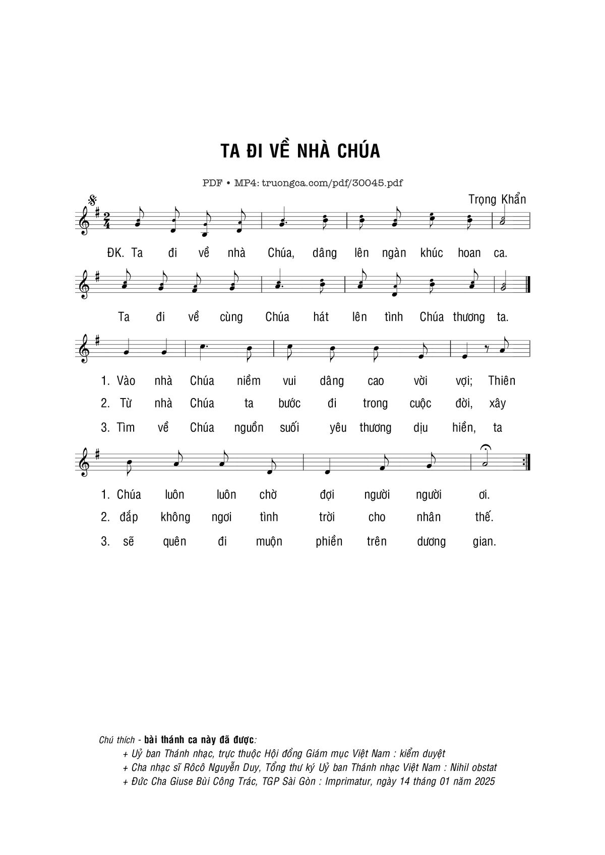 Sheet nhạc có nốt Ta đi về nhà Chúa của nhạc sĩ Trọng Khẩn và file PDF nốt nhạc đăng lên đây nhằm giúp các bạn xướng âm cho đúng nốt và hát thêm hay, chỉ mang tính chất tham khảo, không có mục đích thương mại. Bản quyền thuộc về tác giả và tổ chức nắm bản quyền, Truongca.com không giữ bất kỳ bản quyền của nội dung nào cả. Các bạn có thể tải về bản PDF chất lượng cao, gồm khuông nhạc có nốt với đường link file PDF bên trên.