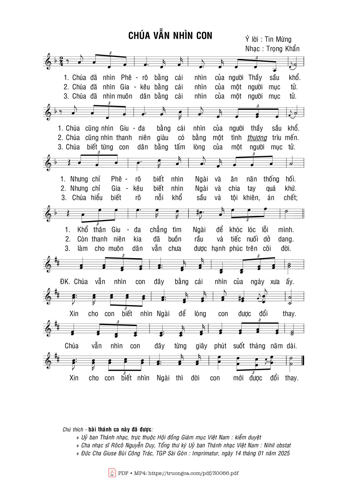 Sheet nhạc có nốt Chúa vẫn nhìn con của nhạc sĩ Trọng Khẩn và file PDF nốt nhạc đăng lên đây nhằm giúp các bạn xướng âm cho đúng nốt và hát thêm hay, chỉ mang tính chất tham khảo, không có mục đích thương mại. Bản quyền thuộc về tác giả và tổ chức nắm bản quyền, Truongca.com không giữ bất kỳ bản quyền của nội dung nào cả. Các bạn có thể tải về bản PDF chất lượng cao, gồm khuông nhạc có nốt với đường link file PDF bên trên.