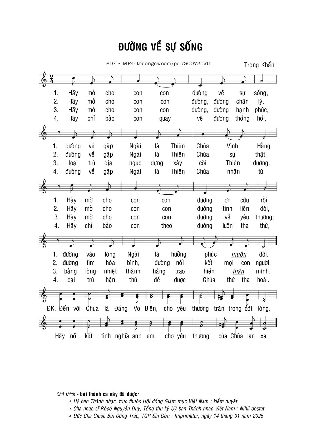 Sheet nhạc có nốt Đường về Sự Sống của nhạc sĩ Trọng Khẩn và file PDF nốt nhạc đăng lên đây nhằm giúp các bạn xướng âm cho đúng nốt và hát thêm hay, chỉ mang tính chất tham khảo, không có mục đích thương mại. Bản quyền thuộc về tác giả và tổ chức nắm bản quyền, Truongca.com không giữ bất kỳ bản quyền của nội dung nào cả. Các bạn có thể tải về bản PDF chất lượng cao, gồm khuông nhạc có nốt với đường link file PDF bên trên.