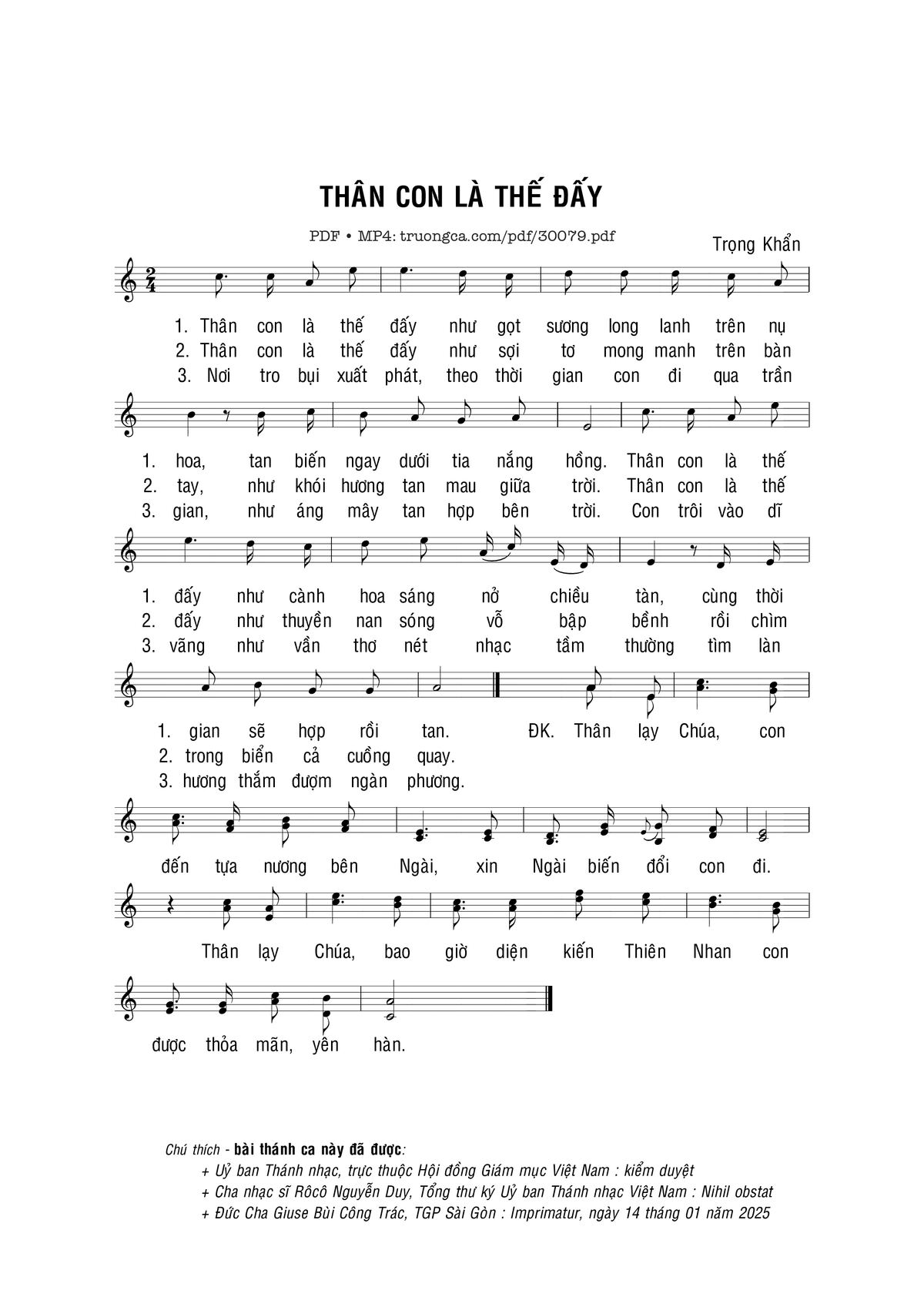 Sheet nhạc có nốt Thân con là thế đấy của nhạc sĩ Trọng Khẩn và file PDF nốt nhạc đăng lên đây nhằm giúp các bạn xướng âm cho đúng nốt và hát thêm hay, chỉ mang tính chất tham khảo, không có mục đích thương mại. Bản quyền thuộc về tác giả và tổ chức nắm bản quyền, Truongca.com không giữ bất kỳ bản quyền của nội dung nào cả. Các bạn có thể tải về bản PDF chất lượng cao, gồm khuông nhạc có nốt với đường link file PDF bên trên.