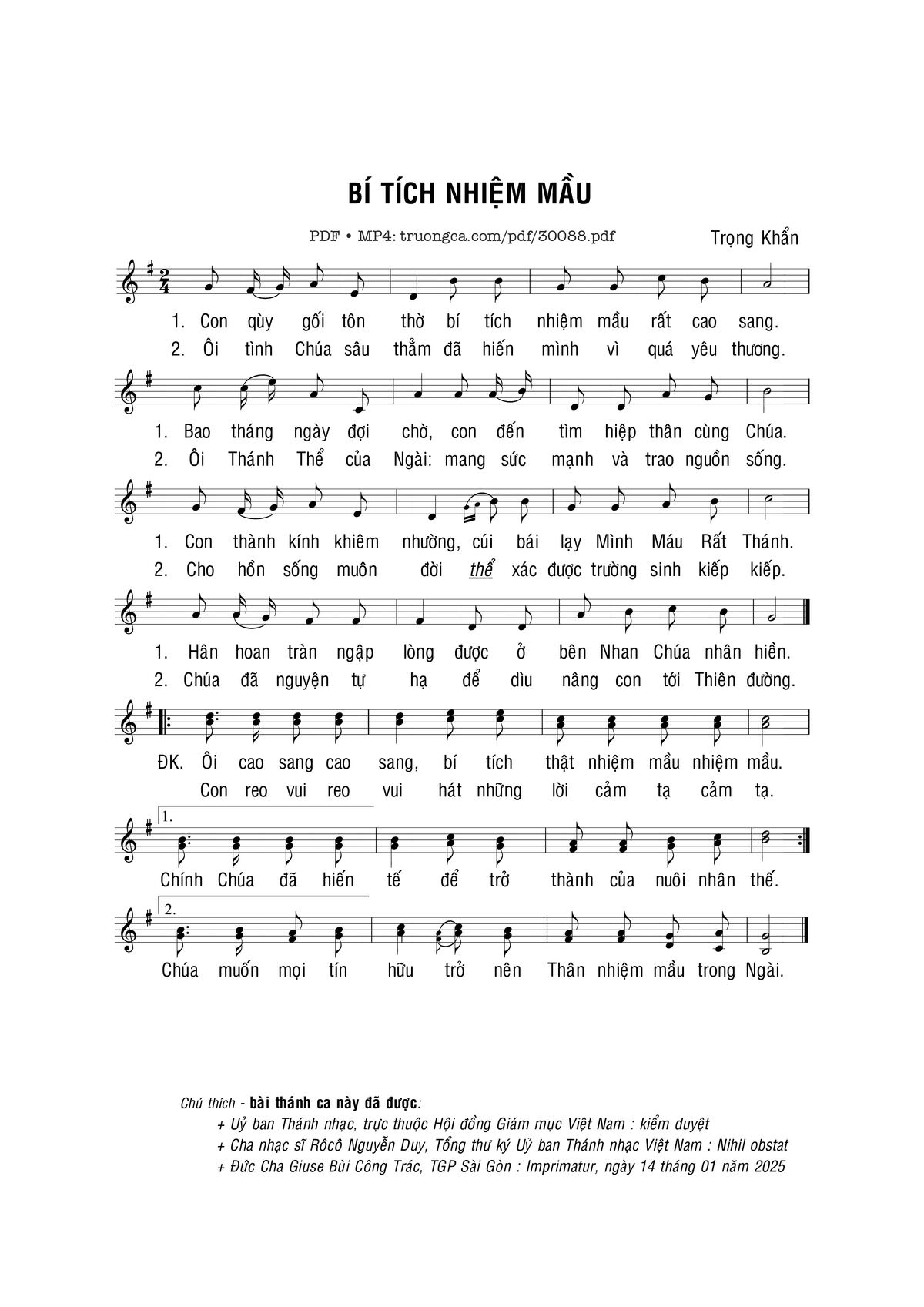 Sheet nhạc có nốt Bí tích nhiệm mầu của nhạc sĩ Trọng Khẩn và file PDF nốt nhạc đăng lên đây nhằm giúp các bạn xướng âm cho đúng nốt và hát thêm hay, chỉ mang tính chất tham khảo, không có mục đích thương mại. Bản quyền thuộc về tác giả và tổ chức nắm bản quyền, Truongca.com không giữ bất kỳ bản quyền của nội dung nào cả. Các bạn có thể tải về bản PDF chất lượng cao, gồm khuông nhạc có nốt với đường link file PDF bên trên.
