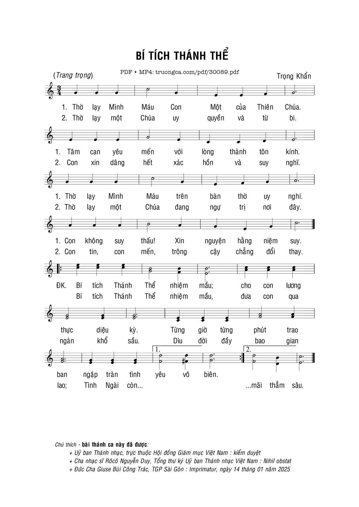 Sheet nhạc có nốt Bí tích Thánh Thể của nhạc sĩ Trọng Khẩn và file PDF nốt nhạc đăng lên đây nhằm giúp các bạn xướng âm cho đúng nốt và hát thêm hay, chỉ mang tính chất tham khảo, không có mục đích thương mại. Bản quyền thuộc về tác giả và tổ chức nắm bản quyền, Truongca.com không giữ bất kỳ bản quyền của nội dung nào cả. Các bạn có thể tải về bản PDF chất lượng cao, gồm khuông nhạc có nốt với đường link file PDF bên trên.