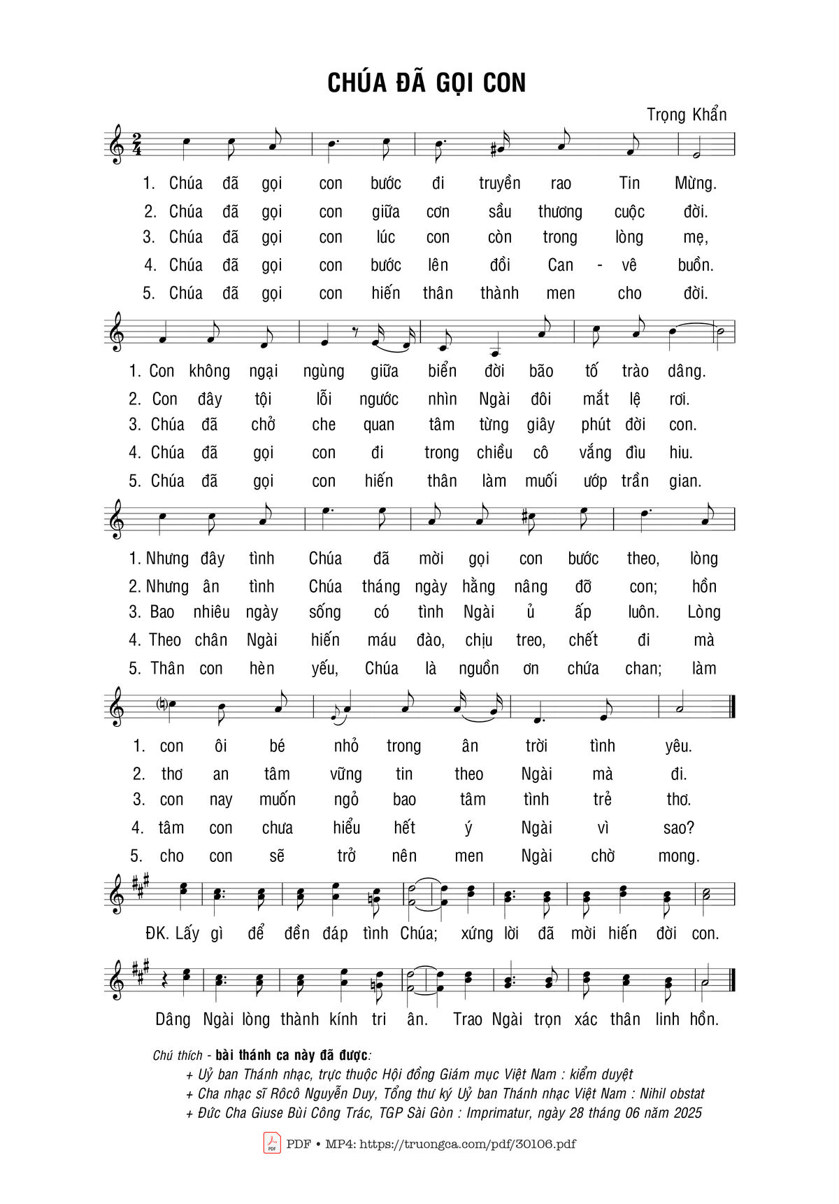 Sheet nhạc có nốt Chúa Đã Gọi Con của nhạc sĩ Trọng Khẩn và file PDF nốt nhạc đăng lên đây nhằm giúp các bạn xướng âm cho đúng nốt và hát thêm hay, chỉ mang tính chất tham khảo, không có mục đích thương mại. Bản quyền thuộc về tác giả và tổ chức nắm bản quyền, Truongca.com không giữ bất kỳ bản quyền của nội dung nào cả. Các bạn có thể tải về bản PDF chất lượng cao, gồm khuông nhạc có nốt với đường link file PDF bên trên.