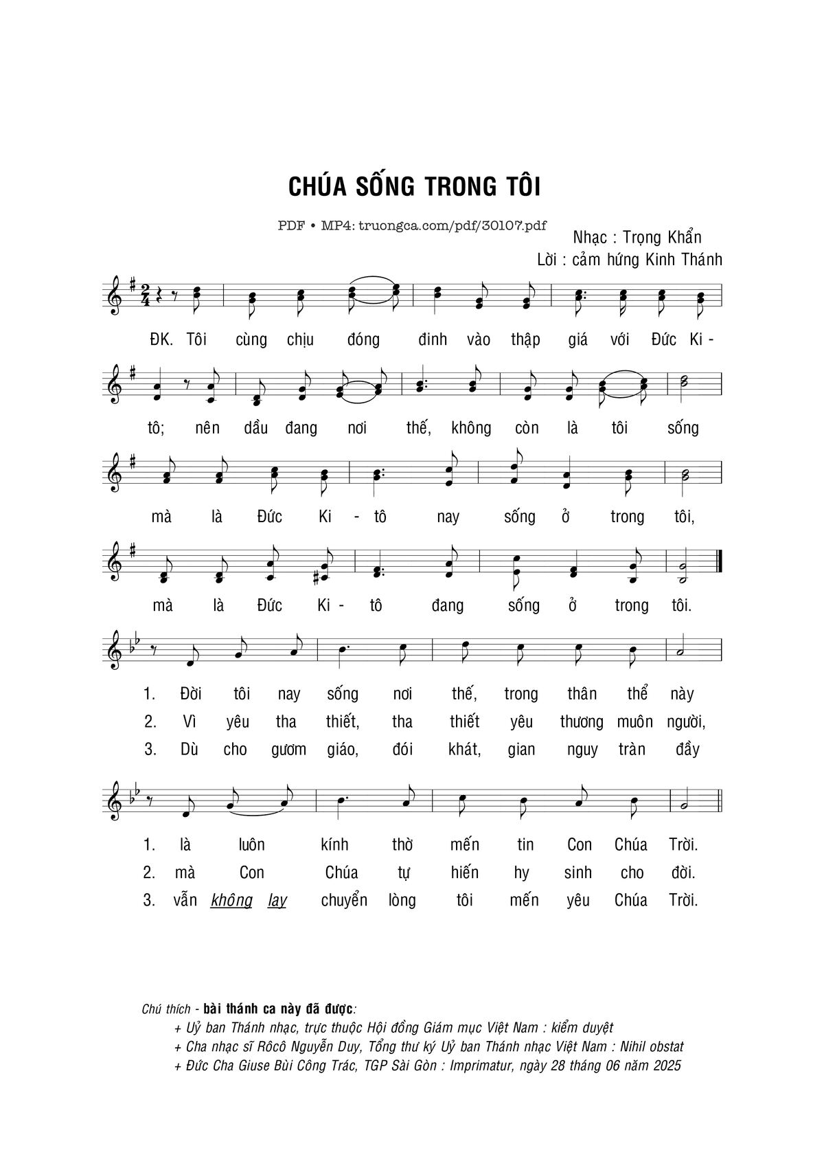 Sheet nhạc có nốt Chúa sống trong tôi của nhạc sĩ Trọng Khẩn và file PDF nốt nhạc đăng lên đây nhằm giúp các bạn xướng âm cho đúng nốt và hát thêm hay, chỉ mang tính chất tham khảo, không có mục đích thương mại. Bản quyền thuộc về tác giả và tổ chức nắm bản quyền, Truongca.com không giữ bất kỳ bản quyền của nội dung nào cả. Các bạn có thể tải về bản PDF chất lượng cao, gồm khuông nhạc có nốt với đường link file PDF bên trên.