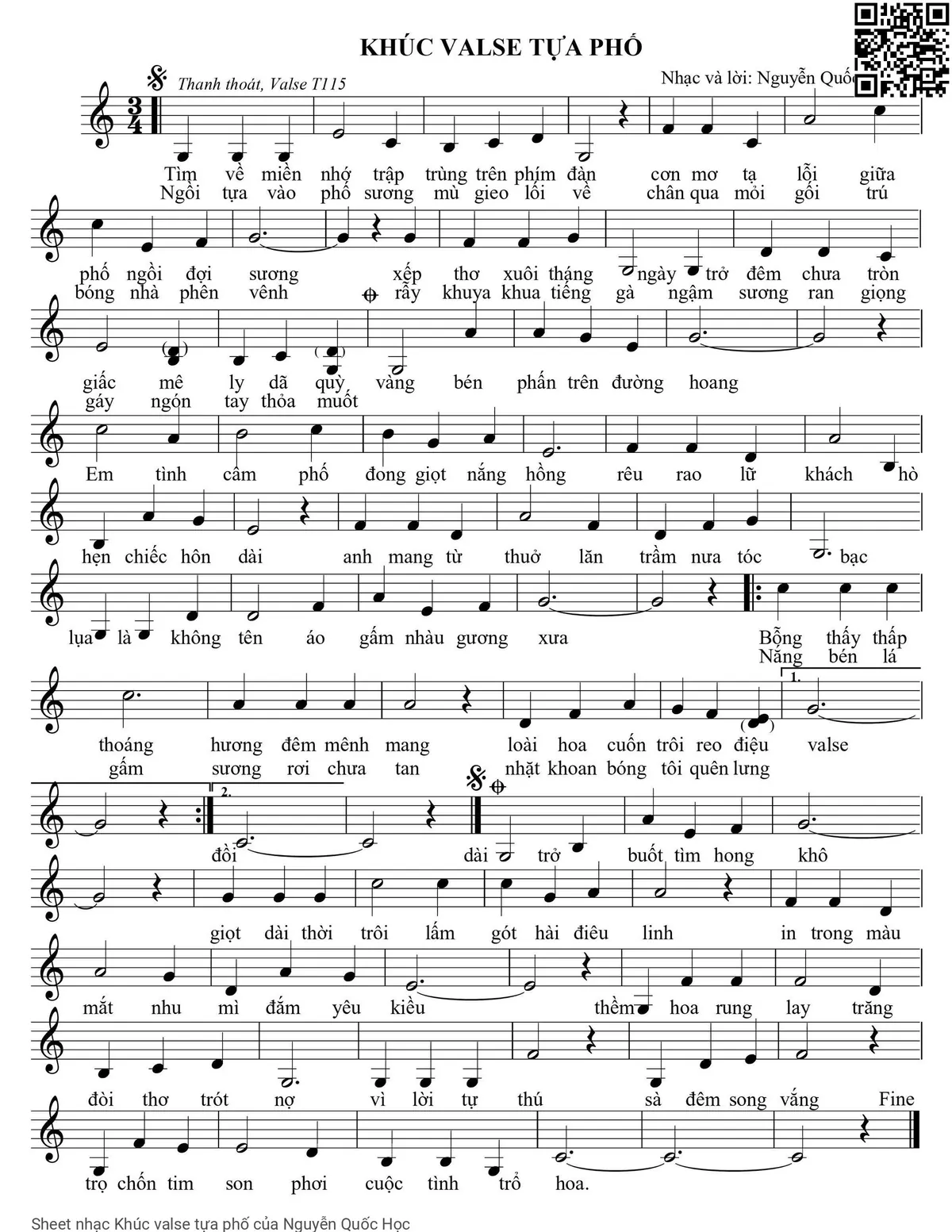 Phần nghe hát Khúc valse tựa phố (Nguyễn Quốc Học) được nhúng từ Youtube, Musescore hoặc link ngoài và chịu sự kiểm soát bản quyền của bên thứ ba đó, vì vậy có thể bị xóa hoặc chèn quảng cáo bất kỳ lúc nào. Nếu bạn không nghe - xem được ca sĩ hát tức là đã bị Youtube hoặc Musescore kiểm soát.