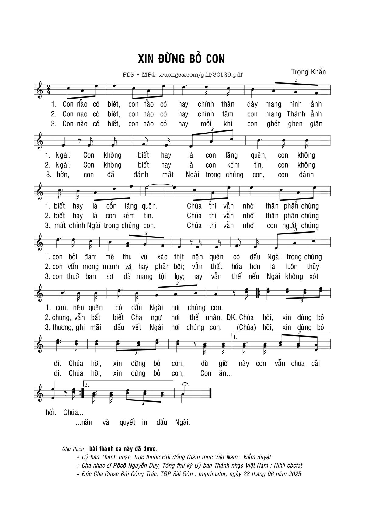 Sheet nhạc có nốt Xin đừng bỏ con của nhạc sĩ Trọng Khẩn và file PDF nốt nhạc đăng lên đây nhằm giúp các bạn xướng âm cho đúng nốt và hát thêm hay, chỉ mang tính chất tham khảo, không có mục đích thương mại. Bản quyền thuộc về tác giả và tổ chức nắm bản quyền, Truongca.com không giữ bất kỳ bản quyền của nội dung nào cả. Các bạn có thể tải về bản PDF chất lượng cao, gồm khuông nhạc có nốt với đường link file PDF bên trên.