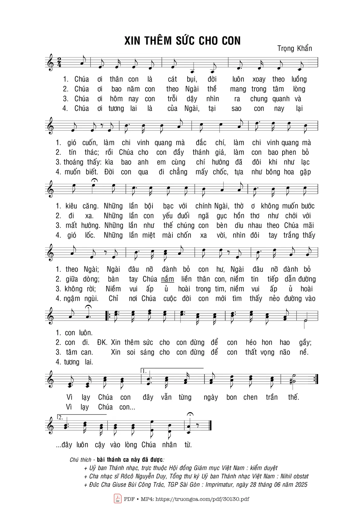 Sheet nhạc có nốt Xin Thêm Sức Cho Con của nhạc sĩ Trọng Khẩn và file PDF nốt nhạc đăng lên đây nhằm giúp các bạn xướng âm cho đúng nốt và hát thêm hay, chỉ mang tính chất tham khảo, không có mục đích thương mại. Bản quyền thuộc về tác giả và tổ chức nắm bản quyền, Truongca.com không giữ bất kỳ bản quyền của nội dung nào cả. Các bạn có thể tải về bản PDF chất lượng cao, gồm khuông nhạc có nốt với đường link file PDF bên trên.