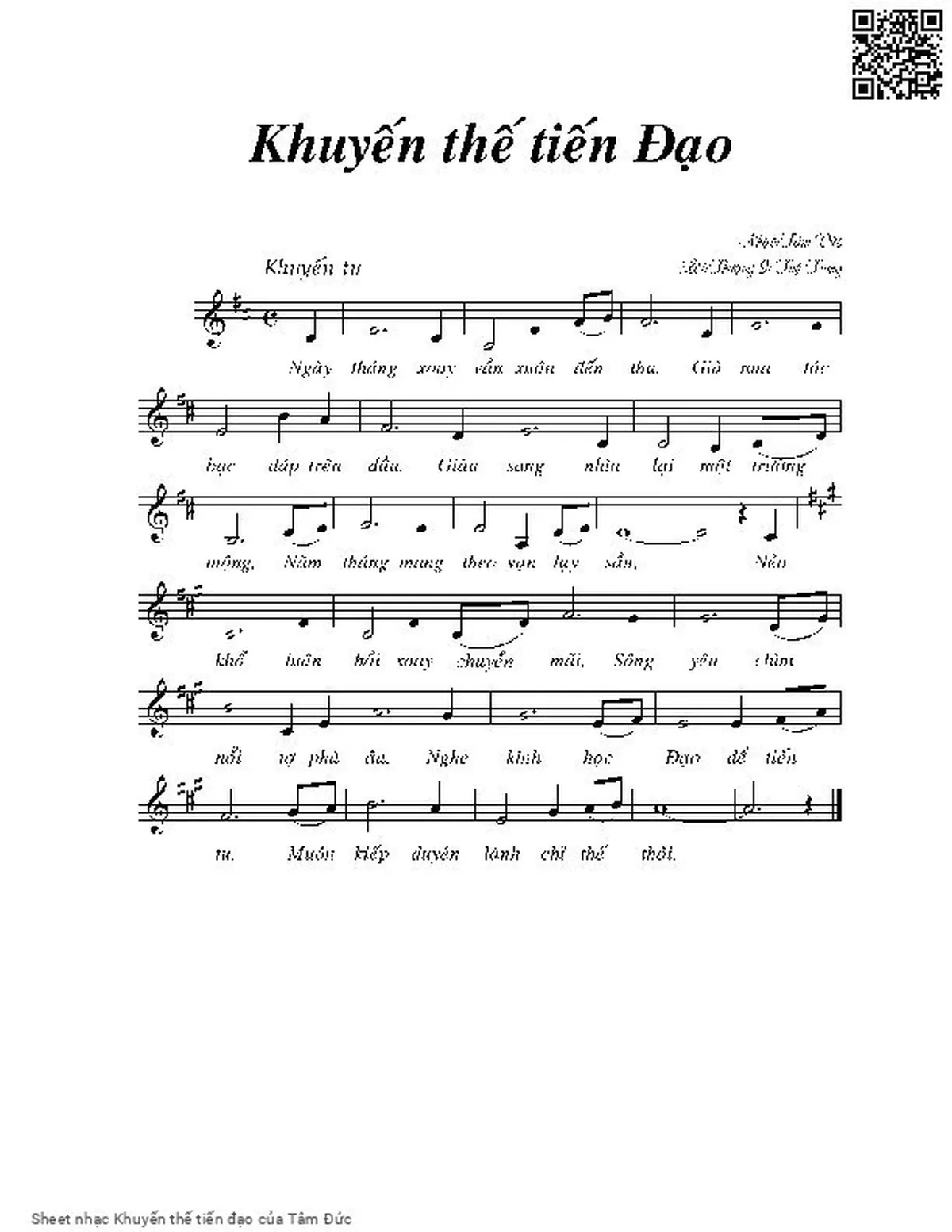 Phần nghe hát Khuyến thế tiến đạo (Tâm Đức) được nhúng từ Youtube, Musescore hoặc link ngoài và chịu sự kiểm soát bản quyền của bên thứ ba đó, vì vậy có thể bị xóa hoặc chèn quảng cáo bất kỳ lúc nào. Nếu bạn không nghe - xem được ca sĩ hát tức là đã bị Youtube hoặc Musescore kiểm soát.