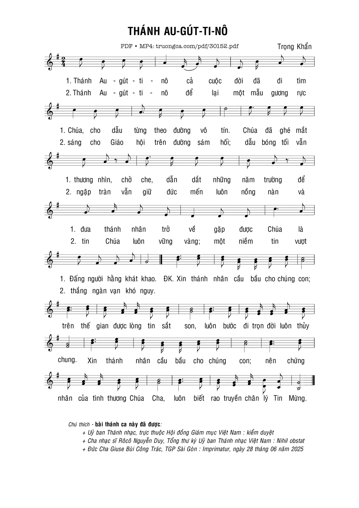 Sheet nhạc có nốt THánh Au-gút-ti-nô của nhạc sĩ Trọng Khẩn và file PDF nốt nhạc đăng lên đây nhằm giúp các bạn xướng âm cho đúng nốt và hát thêm hay, chỉ mang tính chất tham khảo, không có mục đích thương mại. Bản quyền thuộc về tác giả và tổ chức nắm bản quyền, Truongca.com không giữ bất kỳ bản quyền của nội dung nào cả. Các bạn có thể tải về bản PDF chất lượng cao, gồm khuông nhạc có nốt với đường link file PDF bên trên.