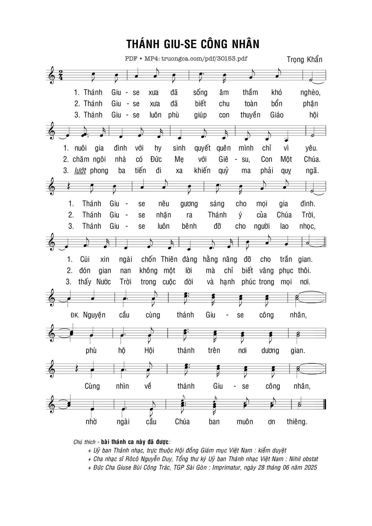 Sheet nhạc có nốt Thánh Giuse công nhân của nhạc sĩ Trọng Khẩn và file PDF nốt nhạc đăng lên đây nhằm giúp các bạn xướng âm cho đúng nốt và hát thêm hay, chỉ mang tính chất tham khảo, không có mục đích thương mại. Bản quyền thuộc về tác giả và tổ chức nắm bản quyền, Truongca.com không giữ bất kỳ bản quyền của nội dung nào cả. Các bạn có thể tải về bản PDF chất lượng cao, gồm khuông nhạc có nốt với đường link file PDF bên trên.
