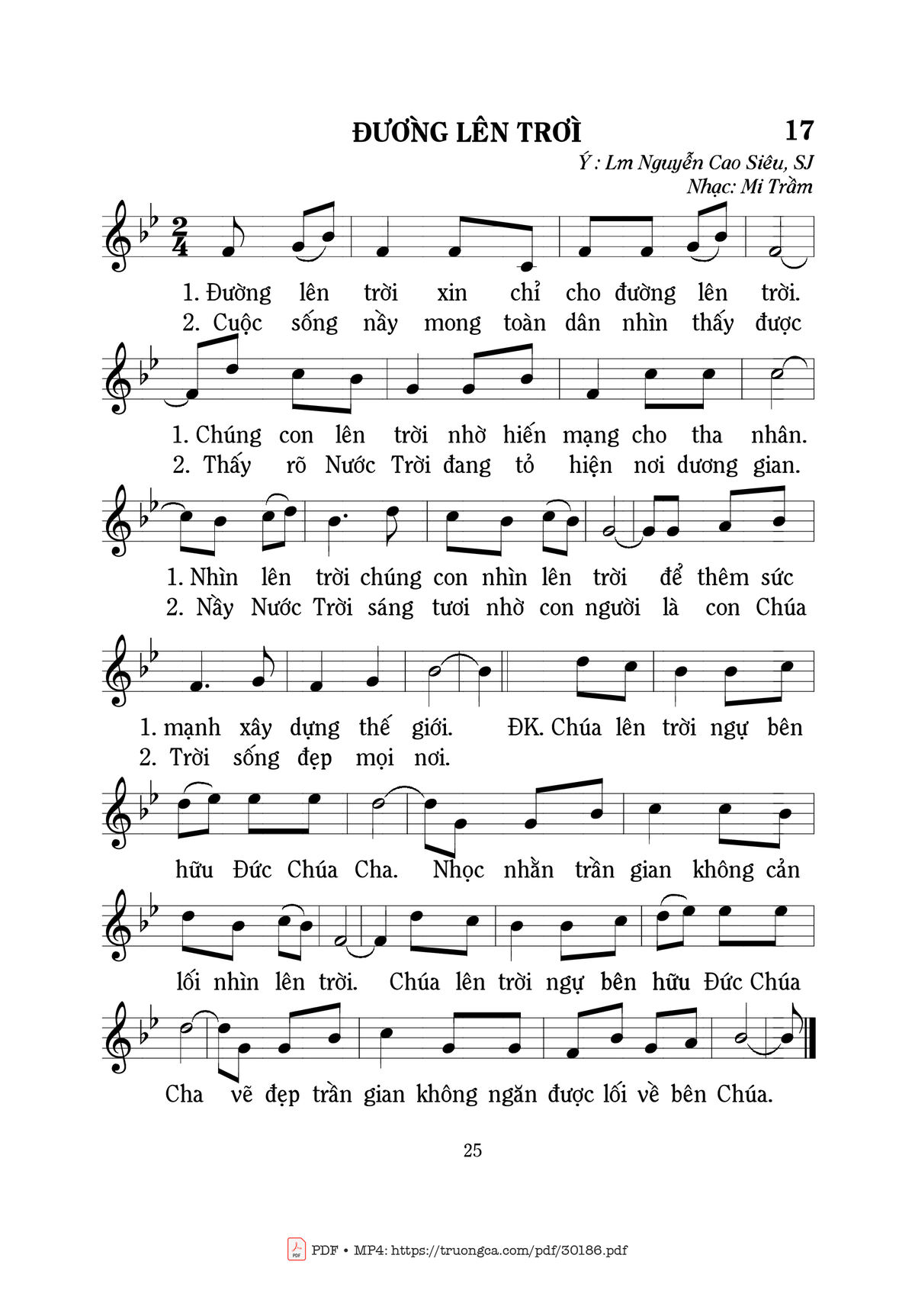 Sheet nhạc có nốt Đường Lên Trời của nhạc sĩ Mi Trầm và file PDF nốt nhạc đăng lên đây nhằm giúp các bạn xướng âm cho đúng nốt và hát thêm hay, chỉ mang tính chất tham khảo, không có mục đích thương mại. Bản quyền thuộc về tác giả và tổ chức nắm bản quyền, Truongca.com không giữ bất kỳ bản quyền của nội dung nào cả. Các bạn có thể tải về bản PDF chất lượng cao, gồm khuông nhạc có nốt với đường link file PDF bên trên.