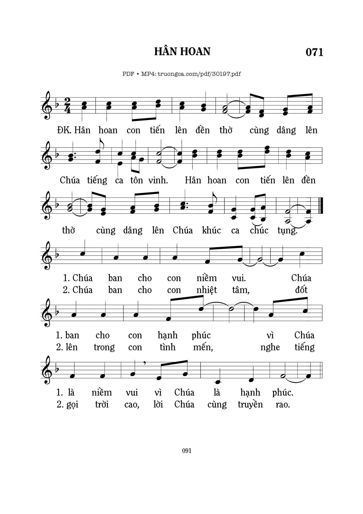 Sheet nhạc có nốt Hân hoan của nhạc sĩ Mi Trầm và file PDF nốt nhạc đăng lên đây nhằm giúp các bạn xướng âm cho đúng nốt và hát thêm hay, chỉ mang tính chất tham khảo, không có mục đích thương mại. Bản quyền thuộc về tác giả và tổ chức nắm bản quyền, Truongca.com không giữ bất kỳ bản quyền của nội dung nào cả. Các bạn có thể tải về bản PDF chất lượng cao, gồm khuông nhạc có nốt với đường link file PDF bên trên.