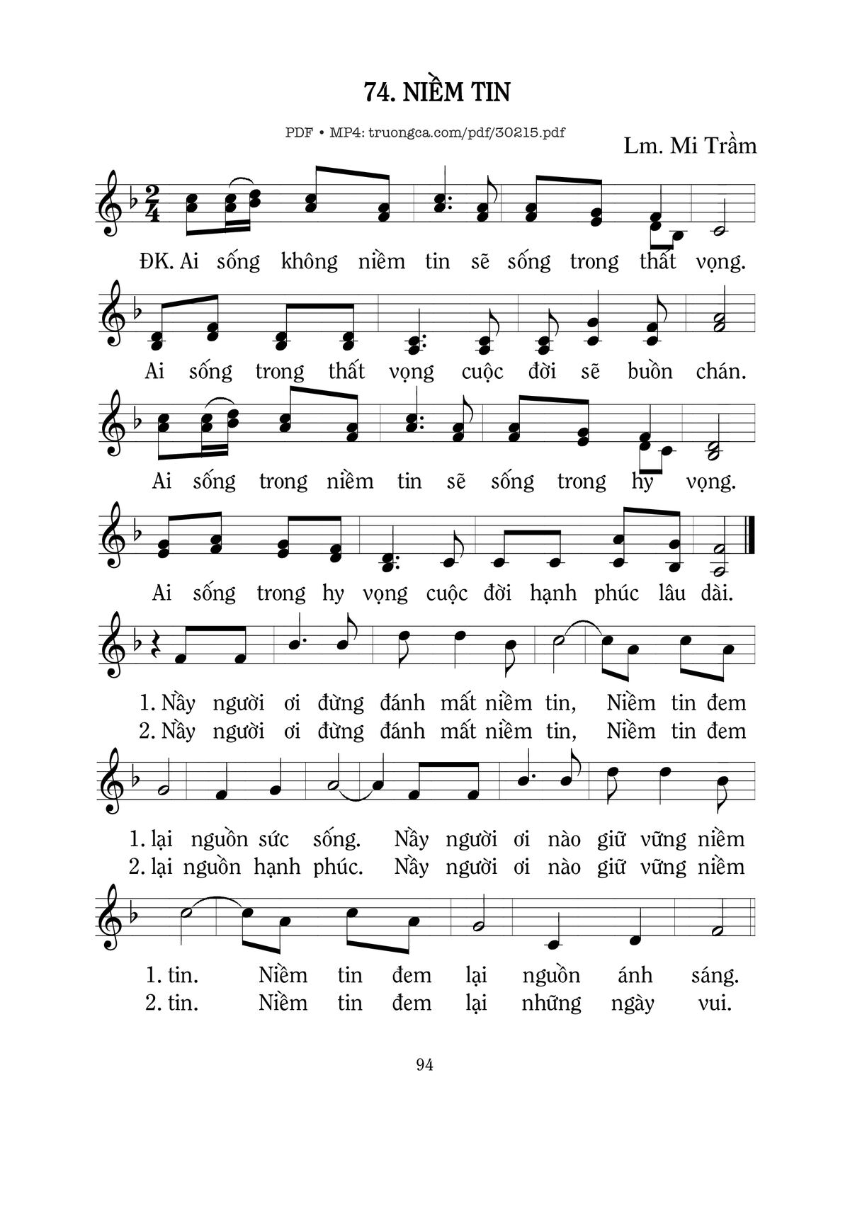 Sheet nhạc có nốt Niềm tin của nhạc sĩ Mi Trầm và file PDF nốt nhạc đăng lên đây nhằm giúp các bạn xướng âm cho đúng nốt và hát thêm hay, chỉ mang tính chất tham khảo, không có mục đích thương mại. Bản quyền thuộc về tác giả và tổ chức nắm bản quyền, Truongca.com không giữ bất kỳ bản quyền của nội dung nào cả. Các bạn có thể tải về bản PDF chất lượng cao, gồm khuông nhạc có nốt với đường link file PDF bên trên.