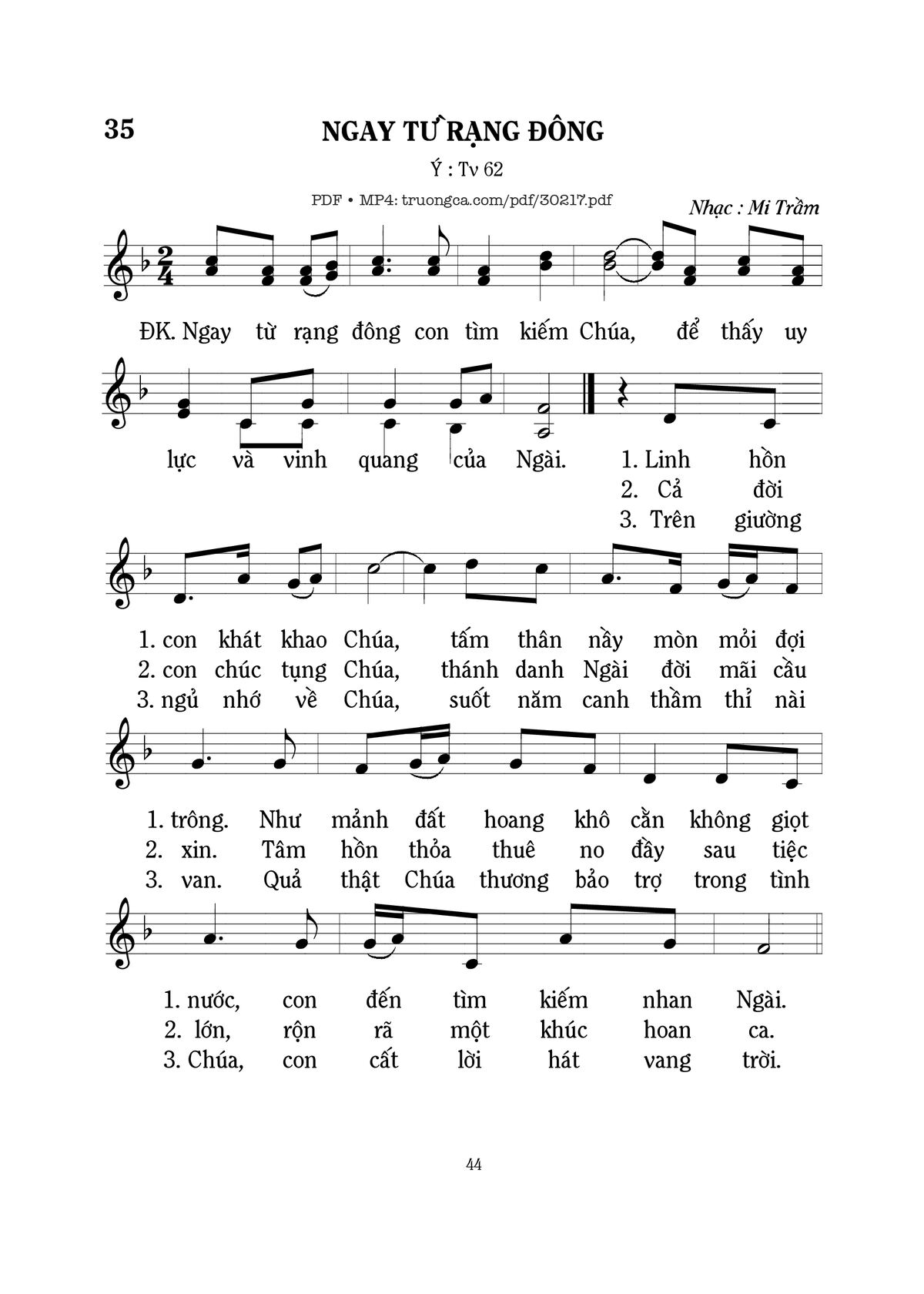 Sheet nhạc có nốt Thánh Vịnh 62, Ngay Từ Rạng Đông của nhạc sĩ Mi Trầm và file PDF nốt nhạc đăng lên đây nhằm giúp các bạn xướng âm cho đúng nốt và hát thêm hay, chỉ mang tính chất tham khảo, không có mục đích thương mại. Bản quyền thuộc về tác giả và tổ chức nắm bản quyền, Truongca.com không giữ bất kỳ bản quyền của nội dung nào cả. Các bạn có thể tải về bản PDF chất lượng cao, gồm khuông nhạc có nốt với đường link file PDF bên trên.
