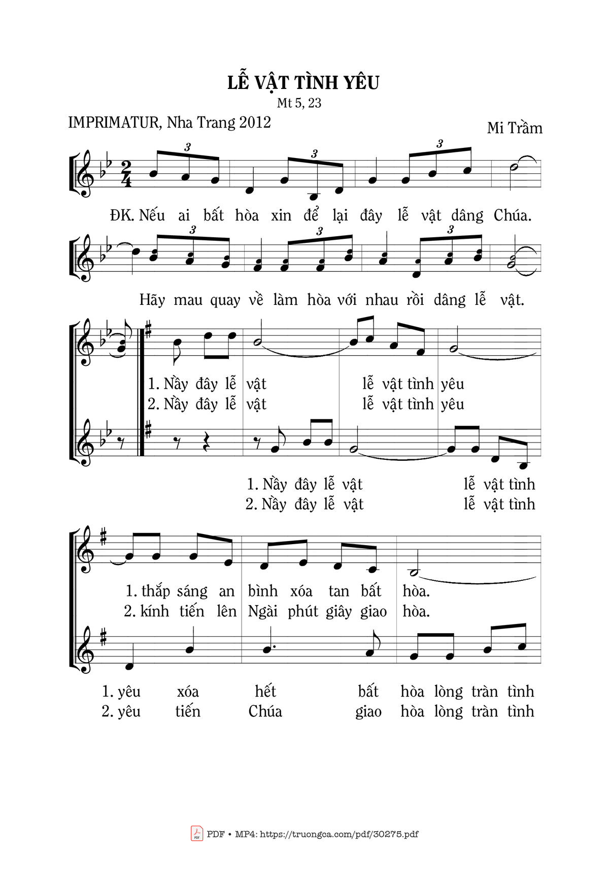 Sheet nhạc có nốt Lễ Vật Tình Yêu của nhạc sĩ Mi Trầm và file PDF nốt nhạc đăng lên đây nhằm giúp các bạn xướng âm cho đúng nốt và hát thêm hay, chỉ mang tính chất tham khảo, không có mục đích thương mại. Bản quyền thuộc về tác giả và tổ chức nắm bản quyền, Truongca.com không giữ bất kỳ bản quyền của nội dung nào cả. Các bạn có thể tải về bản PDF chất lượng cao, gồm khuông nhạc có nốt với đường link file PDF bên trên.