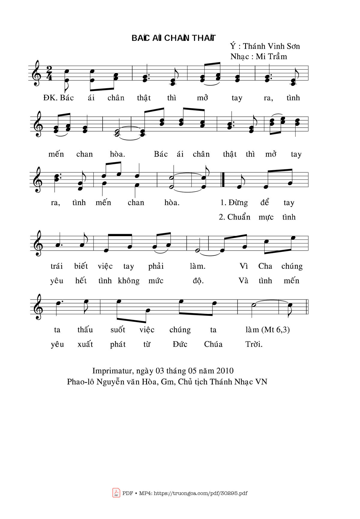 Sheet nhạc có nốt Bác ái chân thật của nhạc sĩ Mi Trầm và file PDF nốt nhạc đăng lên đây nhằm giúp các bạn xướng âm cho đúng nốt và hát thêm hay, chỉ mang tính chất tham khảo, không có mục đích thương mại. Bản quyền thuộc về tác giả và tổ chức nắm bản quyền, Truongca.com không giữ bất kỳ bản quyền của nội dung nào cả. Các bạn có thể tải về bản PDF chất lượng cao, gồm khuông nhạc có nốt với đường link file PDF bên trên.