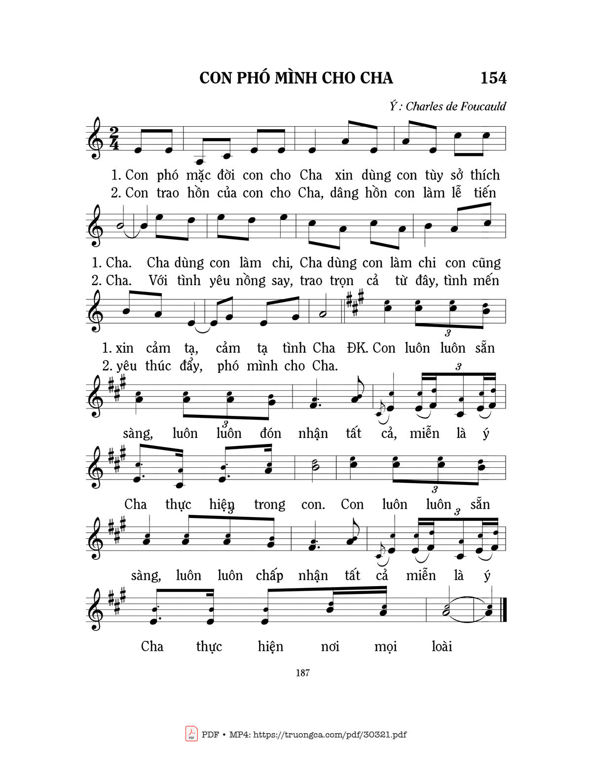 Sheet nhạc có nốt Con phó mình cho Cha của nhạc sĩ Mi Trầm và file PDF nốt nhạc đăng lên đây nhằm giúp các bạn xướng âm cho đúng nốt và hát thêm hay, chỉ mang tính chất tham khảo, không có mục đích thương mại. Bản quyền thuộc về tác giả và tổ chức nắm bản quyền, Truongca.com không giữ bất kỳ bản quyền của nội dung nào cả. Các bạn có thể tải về bản PDF chất lượng cao, gồm khuông nhạc có nốt với đường link file PDF bên trên.