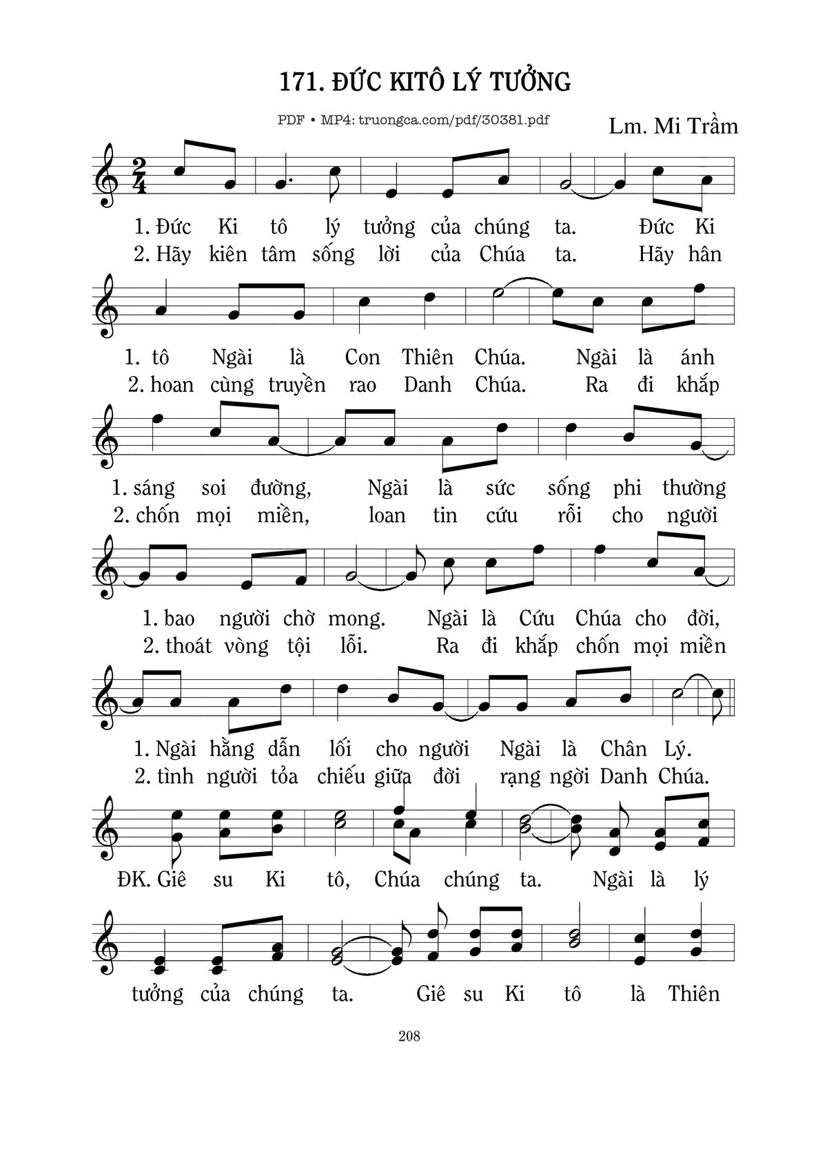 Sheet nhạc có nốt Đức Kitô Lý Tưởng của nhạc sĩ Mi Trầm và file PDF nốt nhạc đăng lên đây nhằm giúp các bạn xướng âm cho đúng nốt và hát thêm hay, chỉ mang tính chất tham khảo, không có mục đích thương mại. Bản quyền thuộc về tác giả và tổ chức nắm bản quyền, Truongca.com không giữ bất kỳ bản quyền của nội dung nào cả. Các bạn có thể tải về bản PDF chất lượng cao, gồm khuông nhạc có nốt với đường link file PDF bên trên.