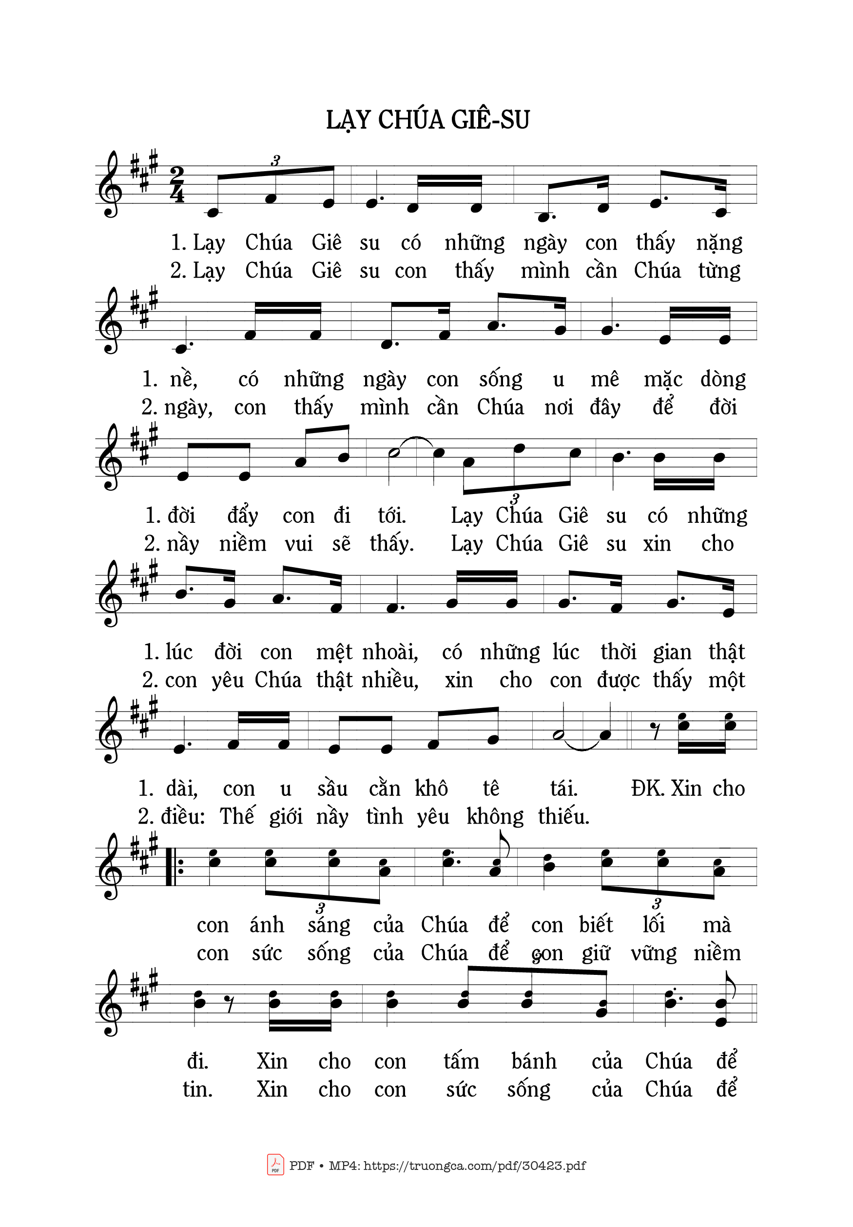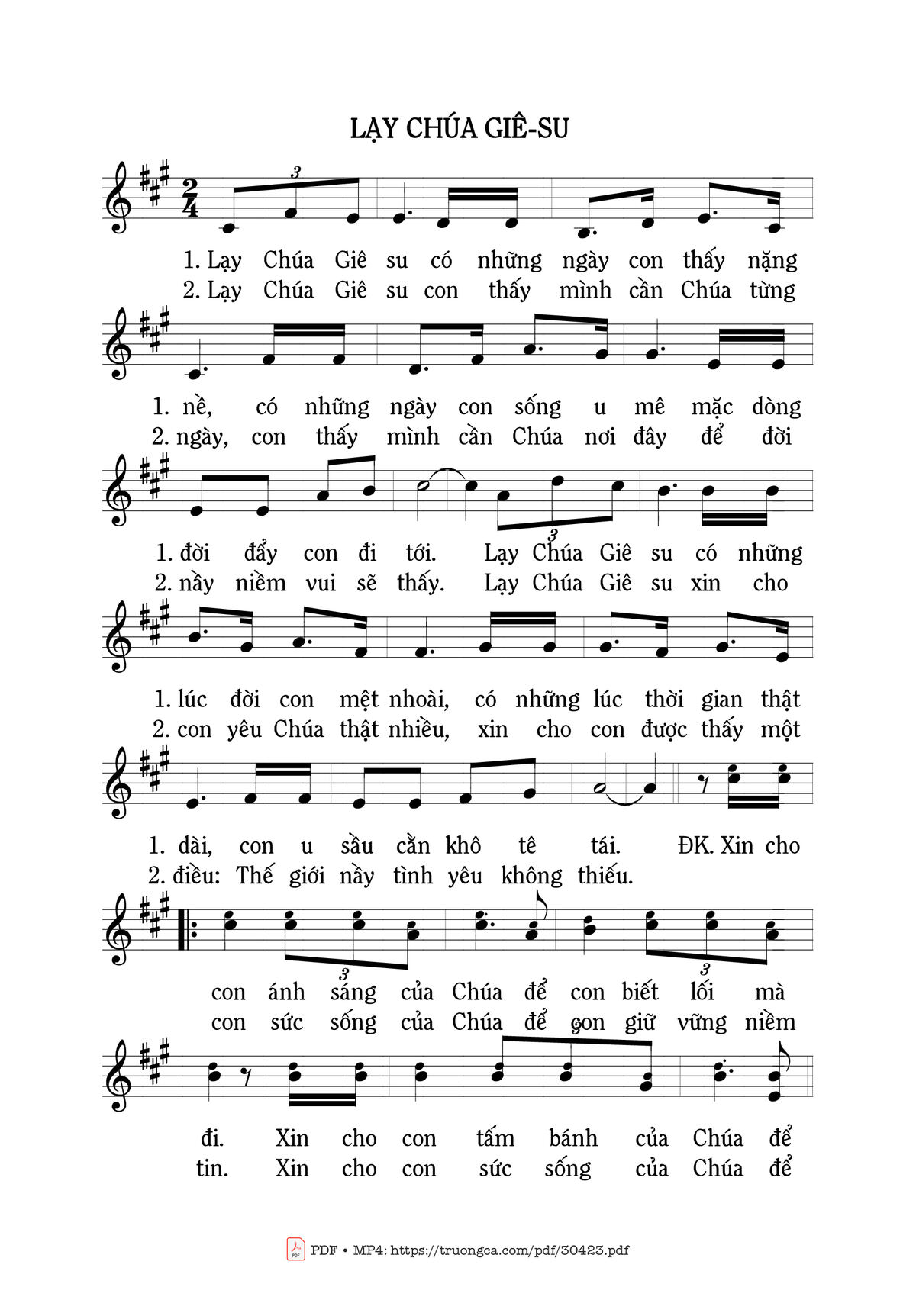 Sheet nhạc có nốt Lạy Chúa Giêsu của nhạc sĩ Mi Trầm và file PDF nốt nhạc đăng lên đây nhằm giúp các bạn xướng âm cho đúng nốt và hát thêm hay, chỉ mang tính chất tham khảo, không có mục đích thương mại. Bản quyền thuộc về tác giả và tổ chức nắm bản quyền, Truongca.com không giữ bất kỳ bản quyền của nội dung nào cả. Các bạn có thể tải về bản PDF chất lượng cao, gồm khuông nhạc có nốt với đường link file PDF bên trên.
