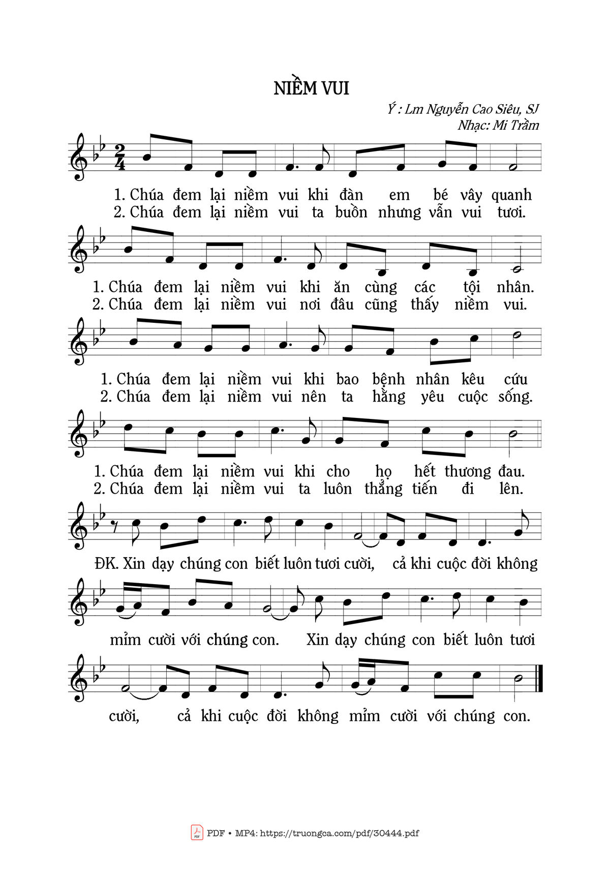 Sheet nhạc có nốt Niềm vui của nhạc sĩ Mi Trầm và file PDF nốt nhạc đăng lên đây nhằm giúp các bạn xướng âm cho đúng nốt và hát thêm hay, chỉ mang tính chất tham khảo, không có mục đích thương mại. Bản quyền thuộc về tác giả và tổ chức nắm bản quyền, Truongca.com không giữ bất kỳ bản quyền của nội dung nào cả. Các bạn có thể tải về bản PDF chất lượng cao, gồm khuông nhạc có nốt với đường link file PDF bên trên.
