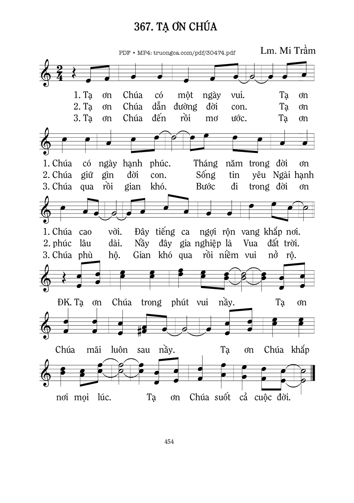 Sheet nhạc có nốt Tạ Ơn Chúa của nhạc sĩ Mi Trầm và file PDF nốt nhạc đăng lên đây nhằm giúp các bạn xướng âm cho đúng nốt và hát thêm hay, chỉ mang tính chất tham khảo, không có mục đích thương mại. Bản quyền thuộc về tác giả và tổ chức nắm bản quyền, Truongca.com không giữ bất kỳ bản quyền của nội dung nào cả. Các bạn có thể tải về bản PDF chất lượng cao, gồm khuông nhạc có nốt với đường link file PDF bên trên.