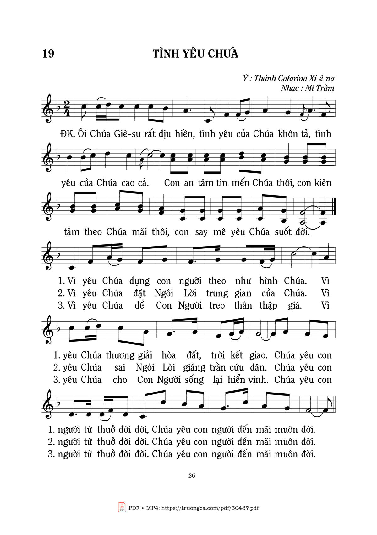 Sheet nhạc có nốt Tình yêu Chúa của nhạc sĩ Mi Trầm và file PDF nốt nhạc đăng lên đây nhằm giúp các bạn xướng âm cho đúng nốt và hát thêm hay, chỉ mang tính chất tham khảo, không có mục đích thương mại. Bản quyền thuộc về tác giả và tổ chức nắm bản quyền, Truongca.com không giữ bất kỳ bản quyền của nội dung nào cả. Các bạn có thể tải về bản PDF chất lượng cao, gồm khuông nhạc có nốt với đường link file PDF bên trên.